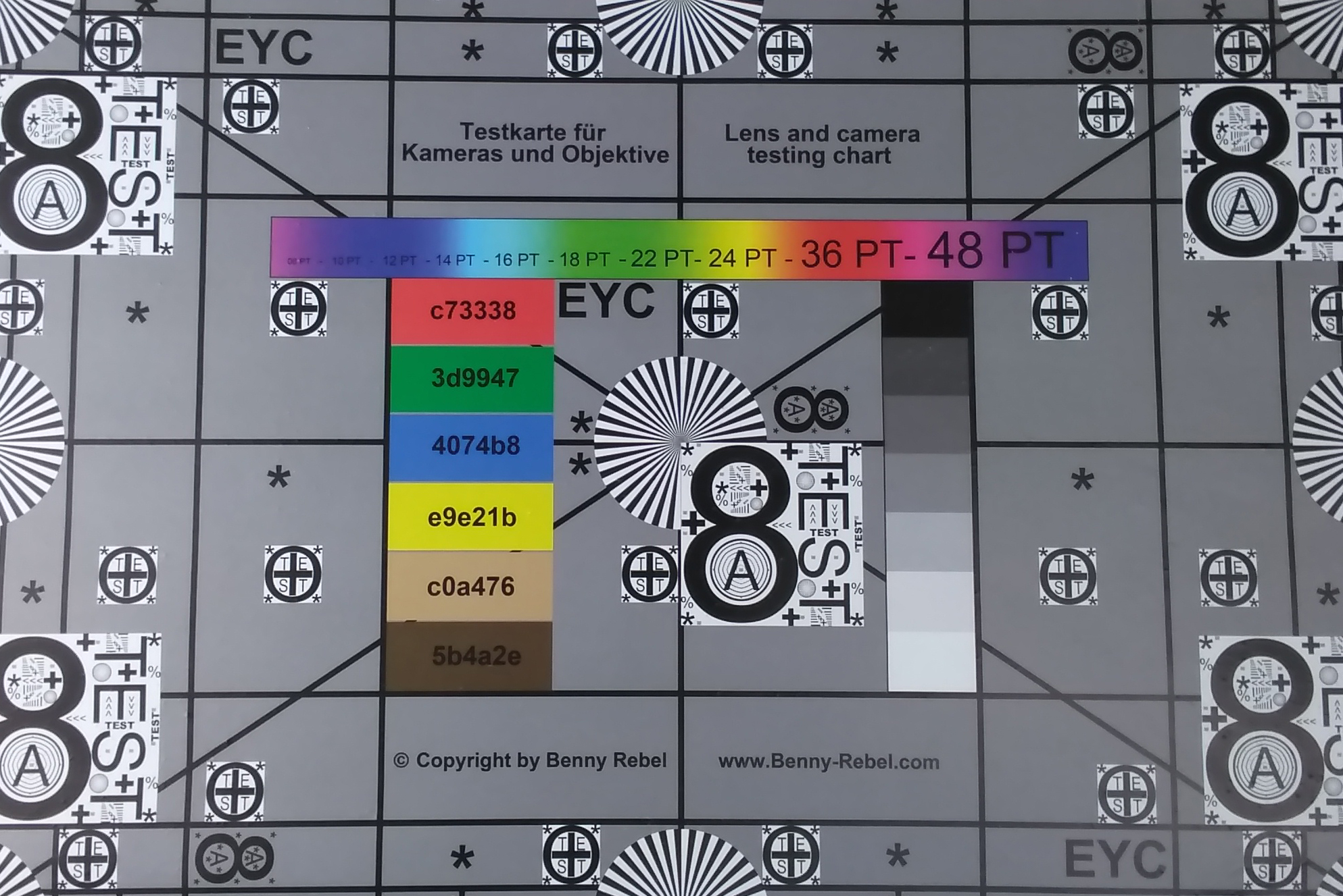 Unter kontrollierten Lichtbedingungen kann das Nokia-Smartphone unseren Testchart gut wiedergeben. Feine Strukturen und Details bleiben in der Bildmitte gut zu erkennen und nur an den Rändern stellt sich eine kleine Unschärfe ein. Die Farben wirken zudem etwas dunkel und in den unteren Ecken lässt sich eine deutliche Blässe erkennen.