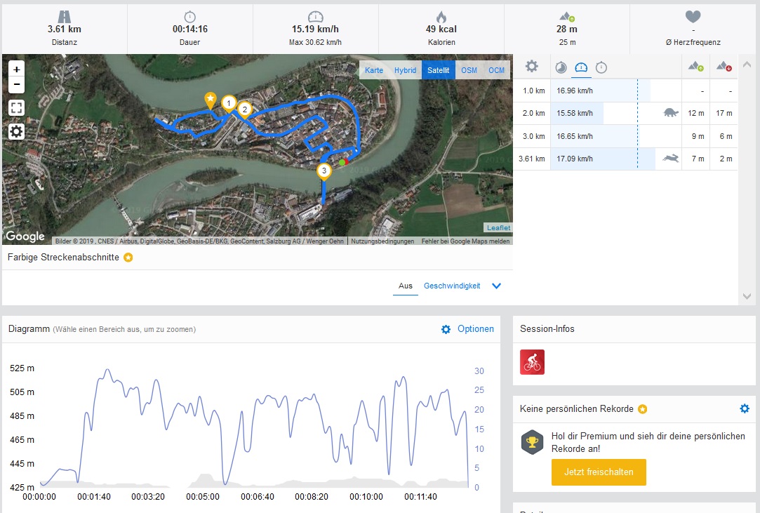 Das Nokia 3.2 schlägt sich in unserem Praxistest, einer Fahrradrunde mit dem Garmin Edge 520 in einigen Passagen recht gut: So kann es am Beginn unserer Fahrt durch enge Altstadtgassen die Strecke recht exakt nachvollziehen. Dann jedoch lässt es ein ganzes Stück der Route aus, die Fahrt über die Brücke ist dann wieder recht exakt. Insgesamt bietet das GPS-Modul des Nokia 3.2 für ein Smartphone dieser Preisklasse allerdings eine sehr ordentliche Vorstellung.