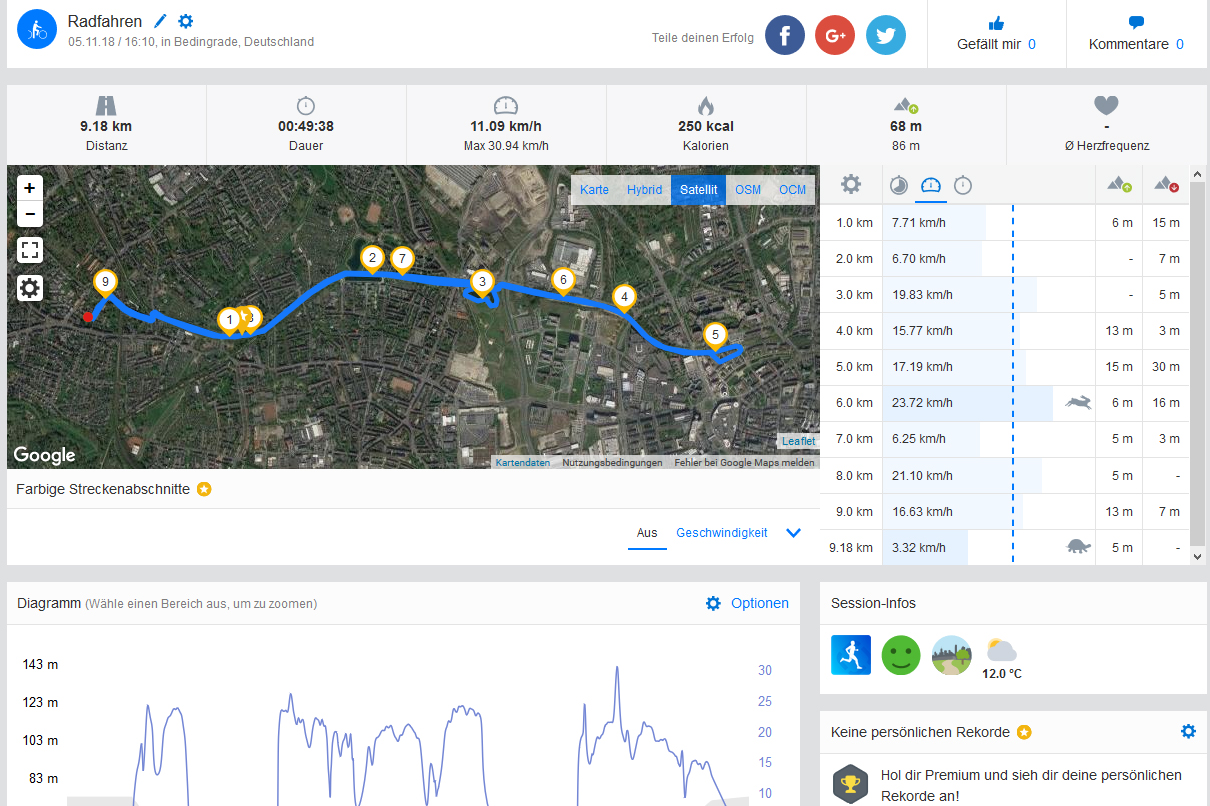 In der freien Wildbahn tritt das Nokia 5.1 gegen das Profi Navi Garmin Edge 500 an und ein kurzer Blick auf die Ergebnisse lässt erahnen, dass es sich nicht um einen Vergleich zwischen Kieselsteinen und Brotkrumen handelt. Der Abstand zwischen beiden Messungen beträgt 80 Meter bei 10 km Gesamtlänge. Der Streckenverlauf ist bei beiden recht ähnlich. Zu erkennen ist die gewohnte Kantenbildung beim Handy im Vergleich zu den deutlich abgerundeten Kurven beim Edge 500, die auf einen selteneren Positionsabruf beim Smartphone hindeuten und wohl auch hauptverantwortlich für die Streckendiskrepanz sein dürfte. Das ist als eher unproblematisch einzustufen. Schwächen zeigt das Nokia 5 vor allem im zweiten Bild im Bereich der Brücke, auf die eine kleine Allee folgt. Hier liegen die Linien recht offensichtlich neben der befahrbaren Strecke. Offenbar stört der Bewuchs hier das Signal. Auch wenn sich Peter Jackson aufgrund der Baumschwäche vielleicht für eine andere Handymarke entscheidet, spricht für alle anderen nichts dagegen, sich mit diesem Telefon in den Großstadtwald hineinzuwagen und auch wieder herauszufinden.