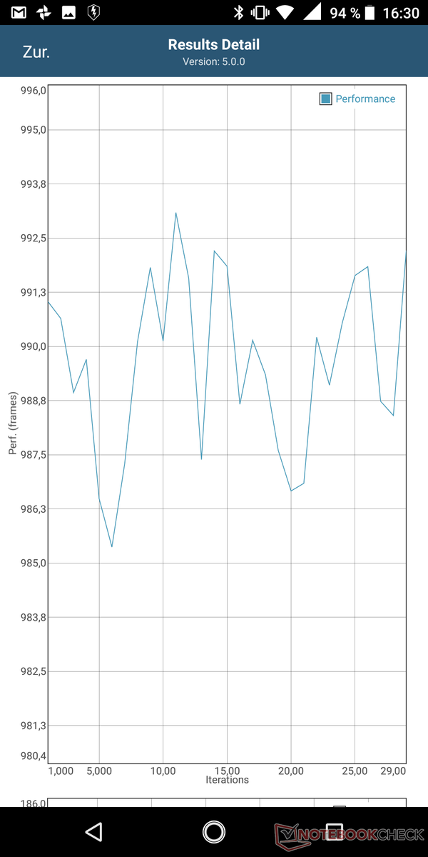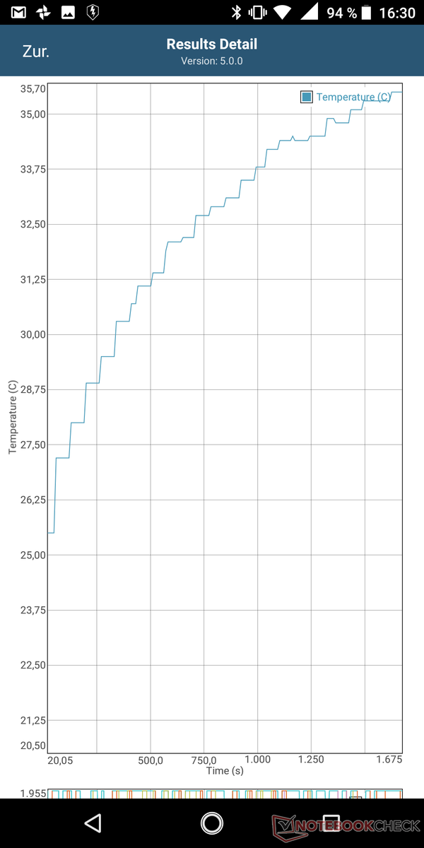 Bereits das Nokia 6.1 präsentierte sich in unserem Test mit äußerst geringer Temperaturentwicklung. Das Nokia 5.1 kann hier teilweise anknüpfen. Es ist zwar nicht ganz so gut zum Abkühlen geeignet wie sein großer Bruder, allerdings sollten Verbrennungen bei angemessenem Gebrauch ausgeschlossen sein. Die Temperaturen bewegen sich unter Last nur 1-2 °C über der Körpertemperatur und sollten verschmerzbar sein. Im Idle-Betrieb ist die Erwärmung mit um die 30 °C gänzlich unkritisch. Der Last-Test mit GFXBench zeigt zudem auch keine erwähnenswerten Einbrüche in der Leistung. Diese bleibt immer über 98 %.