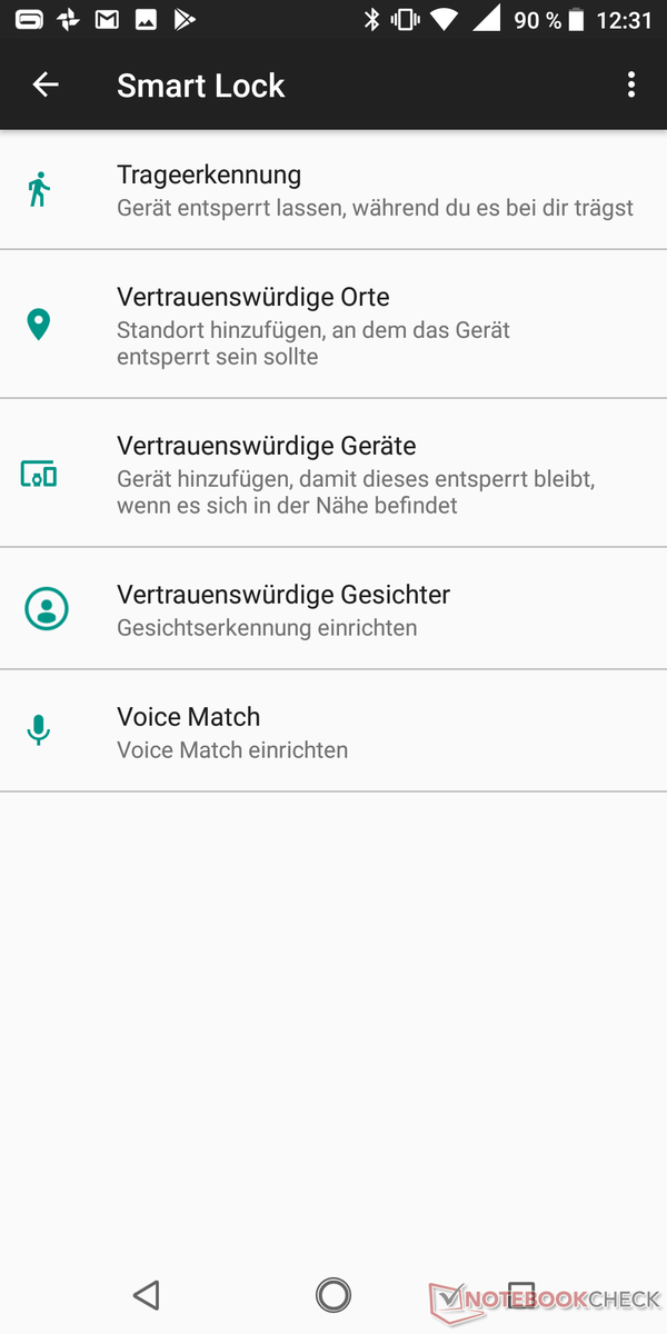 Für die Entsperrung des Telefons und die Sicherung vor unbefugtem Zugriff bietet der Einrichtungsassistent die Nutzung des Fingerabdrucksensors. Dieser kann, vorausgesetzt man trifft ihn auf der Rückseite, das Gerät aus dem Ruhezustand direkt entsperren und funktioniert zuverlässig. Neben der damit verbundenen obligatorischen PIN-Entsperrung bietet das Nokia in den Einstellungen noch eine Reihe von Entsperrungsmöglichkeiten unter dem Menüpunkt "Smart Lock" an. Diese sind mehr an einer komfortablen als an einer sicheren Entsperrung orientiert.