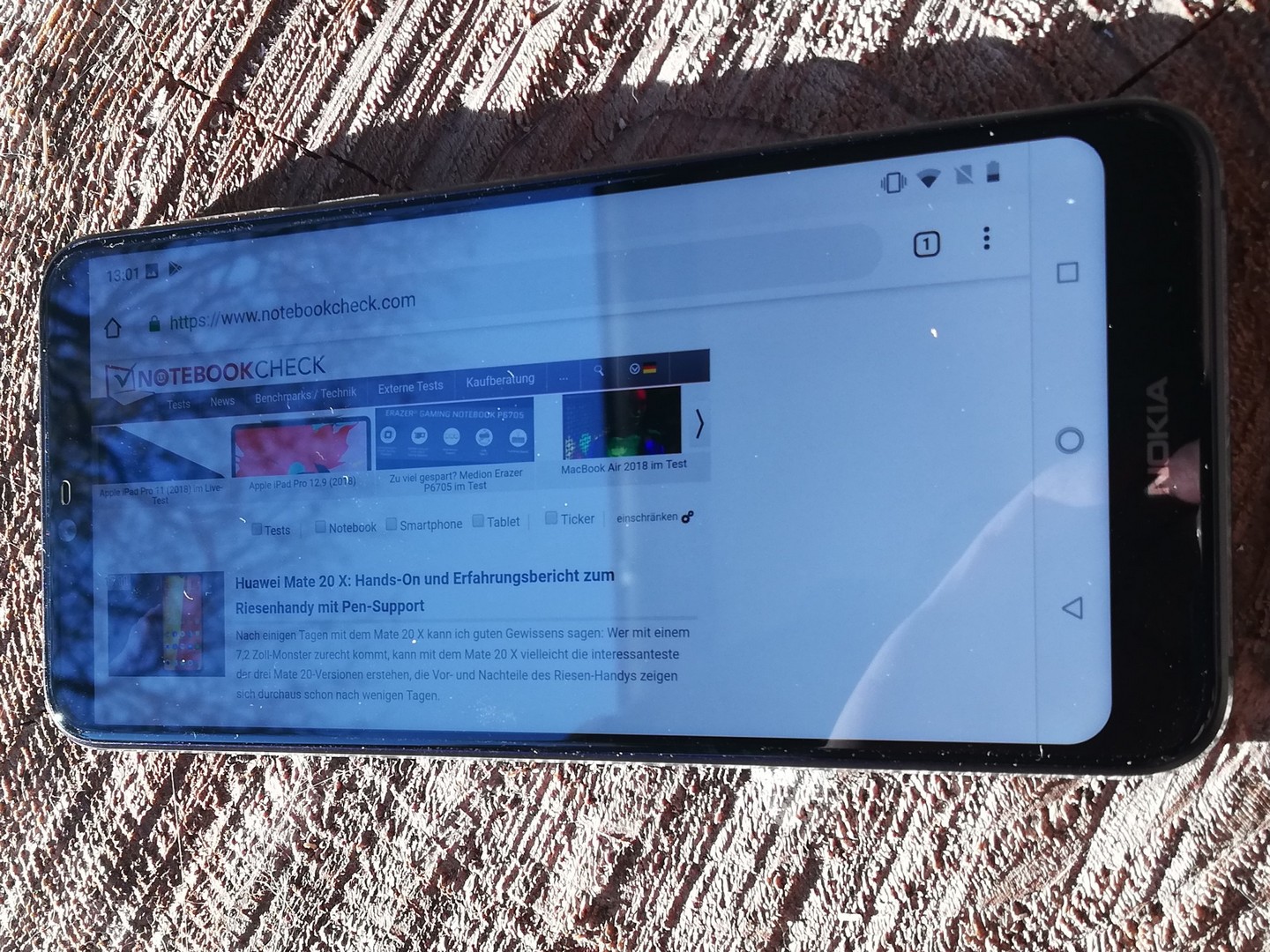 Im Freien kann das Nokia 7.1 durch seine gut Displayhelligkeit problemlos verwendet werden. Die Bildschirmoberfläche spiegelt Objekte in der Umgebung allerdings vergleichsweise stark wieder, sodass der Blick auf Bildinhalte etwas erschwert wird. In geschlossen Räumen führen künstliche Lichtquellen ebenfalls zu störenden Reflexionen.