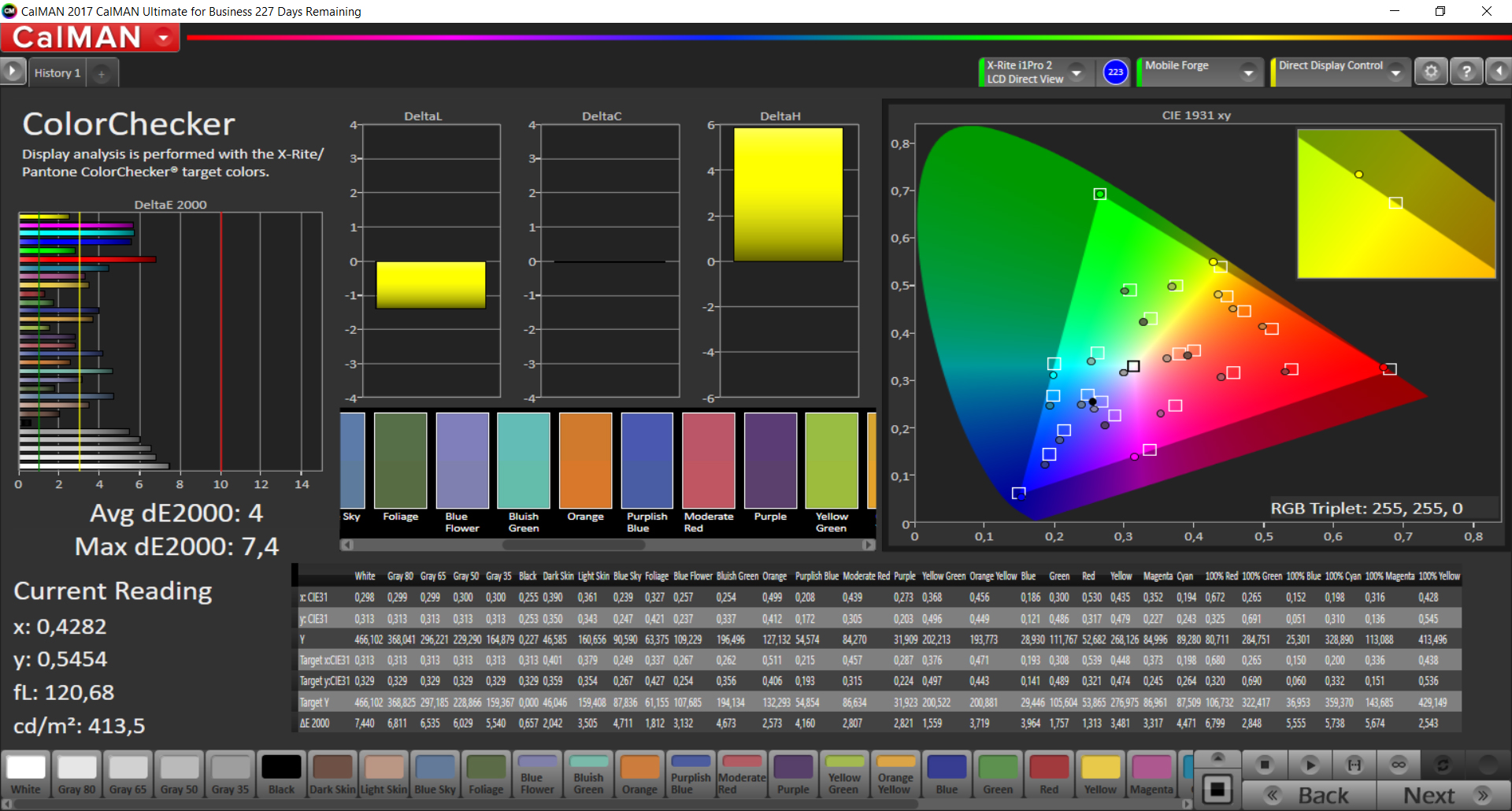 Die Analyse des Fotospektrometers und der CalMAN Software ergibt mit 4 (Farben) beziehungsweise 4,7 (Graustufen) relativ geringe durchschnittliche Delta-E-Abweichungen zum sRGB-Farbraum, bei einem Idealbereich von Werten <3. Ein Blick zur Konkurrenz offenbart aber durchaus Verbesserungspotential.