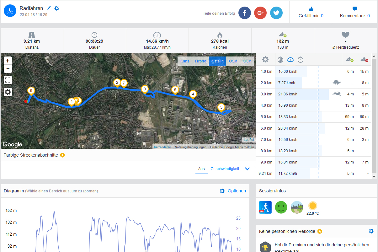 Um die Ortungsgenauigkeit unseres Testgerätes in der Praxis einschätzen zu können, zeichnen wir parallel eine Strecke zu Vergleichszwecken mit dem GPS-Fahrradcomputer Garmin Edge 500 und dem Smartphone auf. Nur 90 Meter liegen zwischen dem 7 Plus und dem Profi-Navi am Ende der gut 9 Kilometer langen Teststrecke. Ein guter Wert, der problemlos zur Navigation mit dem Auto oder Fahrrad reicht.