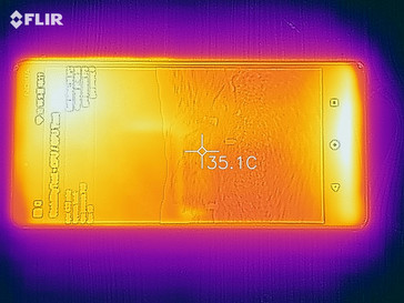 Sowohl die Rück- als auch Vorderseite des Nokia 7 Plus erwärmen sich unter Last recht ungleichmäßig. Während im Test auf der Vorderseite maximal knapp 40 °C gemessen werden, weist die Rückseite eine geringfügig geringe maximale Oberflächentemperatur von knapp 39 °C auf. Die unter Lastbedingungen anfallenden Temperaturen sind im Alltag aber nur bedingt spürbar. Selbst bei längeren Spielephasen wird das Nokia Smartphone nicht störend warm.