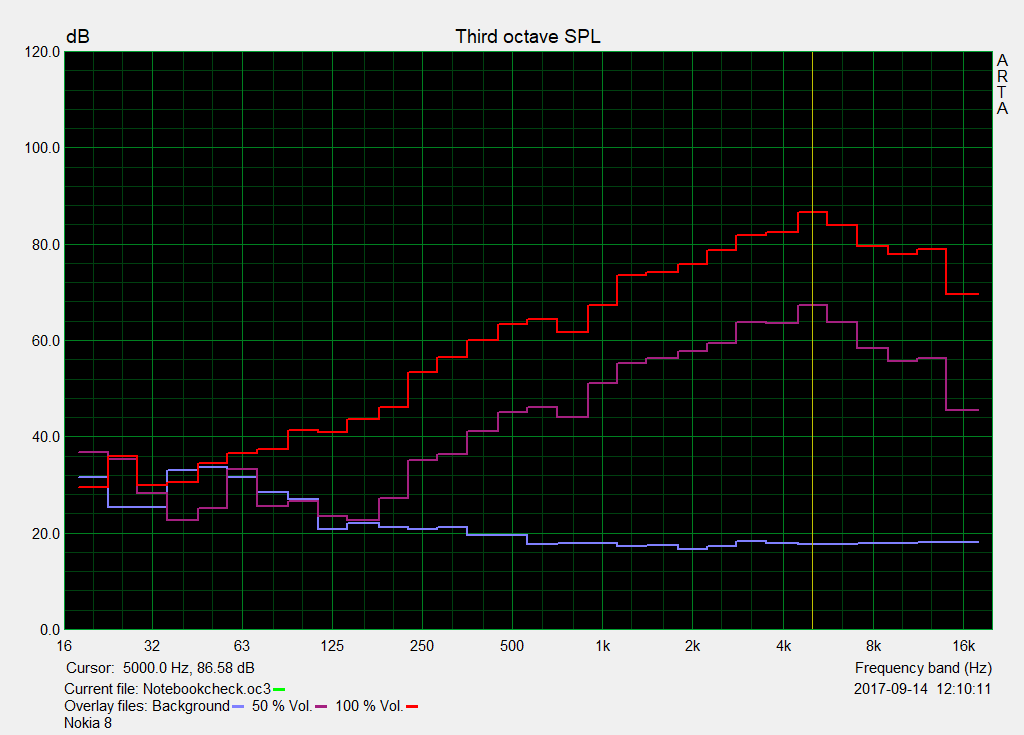 Mit dem Spektralfotometer und der Analyse-Software CalMAN betrachtet zeigen sich weitere Schwächen. Mit einer Farbtemperatur von 8.906 K ist die Darstellung deutlich ins Blaue verschoben und wird deshalb ziemlich unterkühlt. Bei der Farb- und Graustufendarstellung geht das Nokia 8 nicht allzu genau zu Werke. Abweichungen von DeltaE < 3 sind für den Betrachter nicht wahrnehmbar – eine Hürde, die das Smartphone sowohl bei den Farben (DeltaE 6,7) als auch den Graustufen (DeltaE 8,3) reißt. Damit kann das Nokia 8 der versammelten Konkurrenz nicht das Wasser reichen, die hier durchwegs mustergültige Werte abliefert.