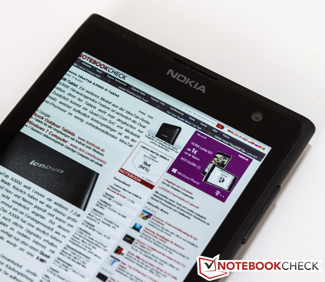 Das 4,5-Zoll-Display hat leider einen gravierenden Mangel. Mit einer Auflösung von 1.280 x 768 Pixeln ist das Highend-Modell nicht gerade üppig bestückt. Hier hätten wir uns von Nokia deutlich mehr erwartet, denn die Konkurrenz verbaut seit geraumer Zeit Full-HD-Displays. Die durchschnittliche Helligkeit des OLED-Panels liegt bei 287,9 cd/m². Bedingt durch die Windows-Phone-Systemeinstellungen können nur drei Helligkeitseinstellungen manuell vorgenommen werden. Die Bedienung bei Android- oder iOS-Geräten ist deutlich komfortabler. Mit 88 % ist die Ausleuchtung, subjektiv betrachtet, homogen. Um eine Topwertung zu erhalten, müsste diese jedoch weit der 90 %-Marke liegen. Aufgrund des Schwarzwerts nahe null, strebt der Kontrast gegen unendlich. Beide Messwerte könnten somit nicht besser sein.