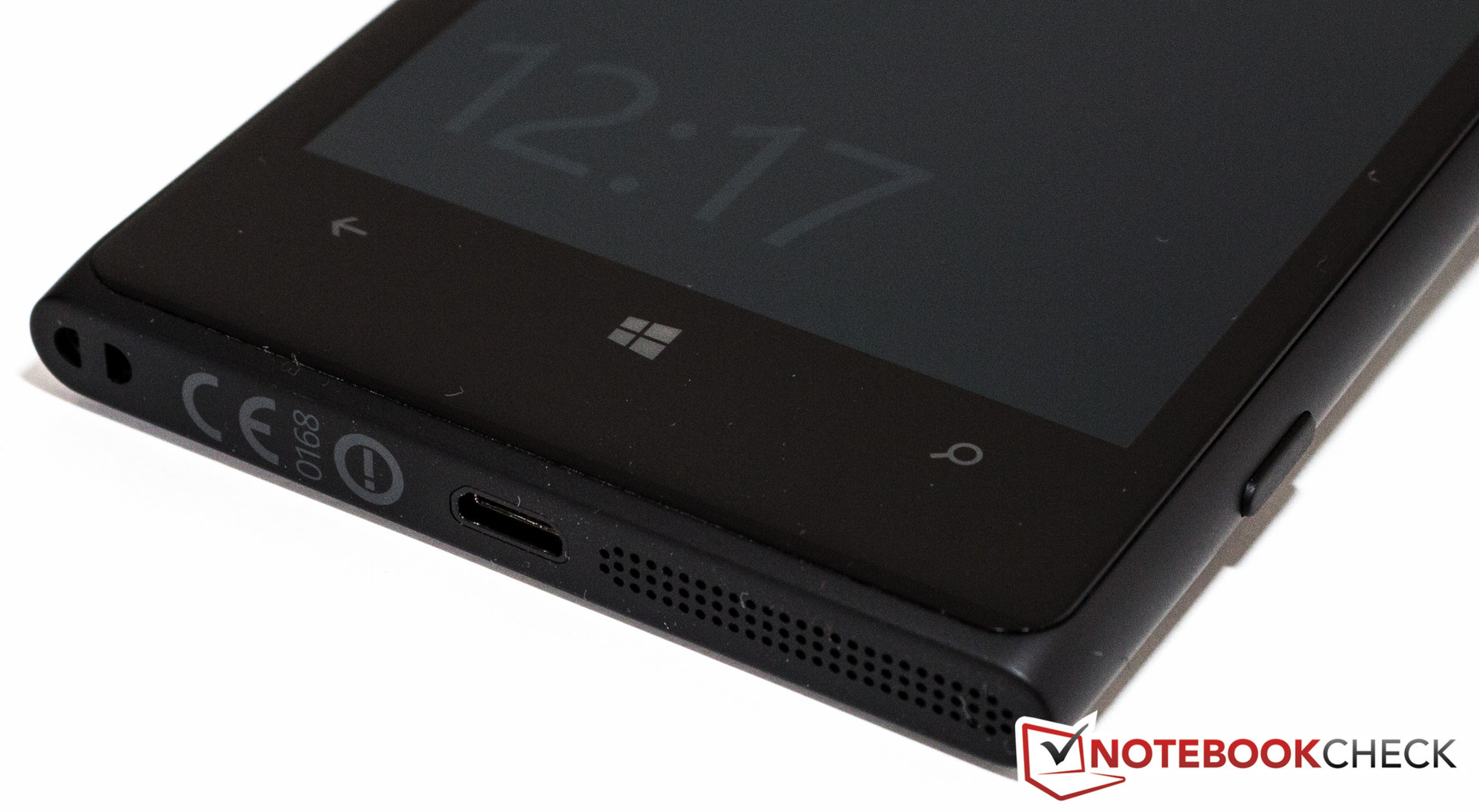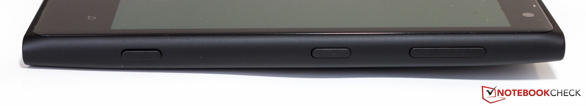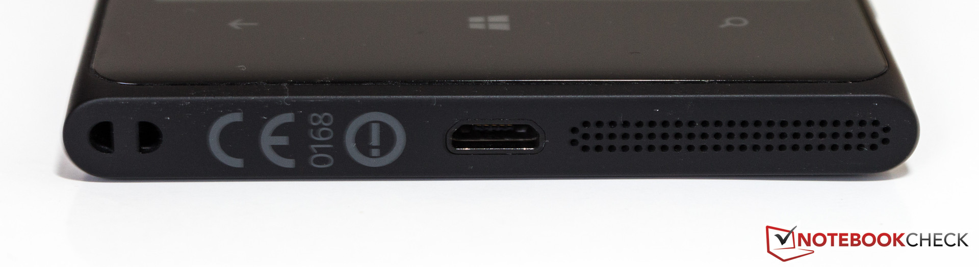 Von Geräten der Lumia-Serie kennt man die Anordnung der Tasten und Anschlüsse. An der Oberseite befinden sich der Einschub für die Micro-SIM-Karte und der zentrierte 3,5-mm-Klinkenanschluss. Die linke Geräteseite ist frei von Tasten. Dafür sind an der gegenüberliegenden Seite die Lautstärkewippe, der Power-Button und der Kameraauslöser angebracht. An der Unterseite zeigen sich der Mono-Lautsprecher und der Micro-USB-Anschluss.