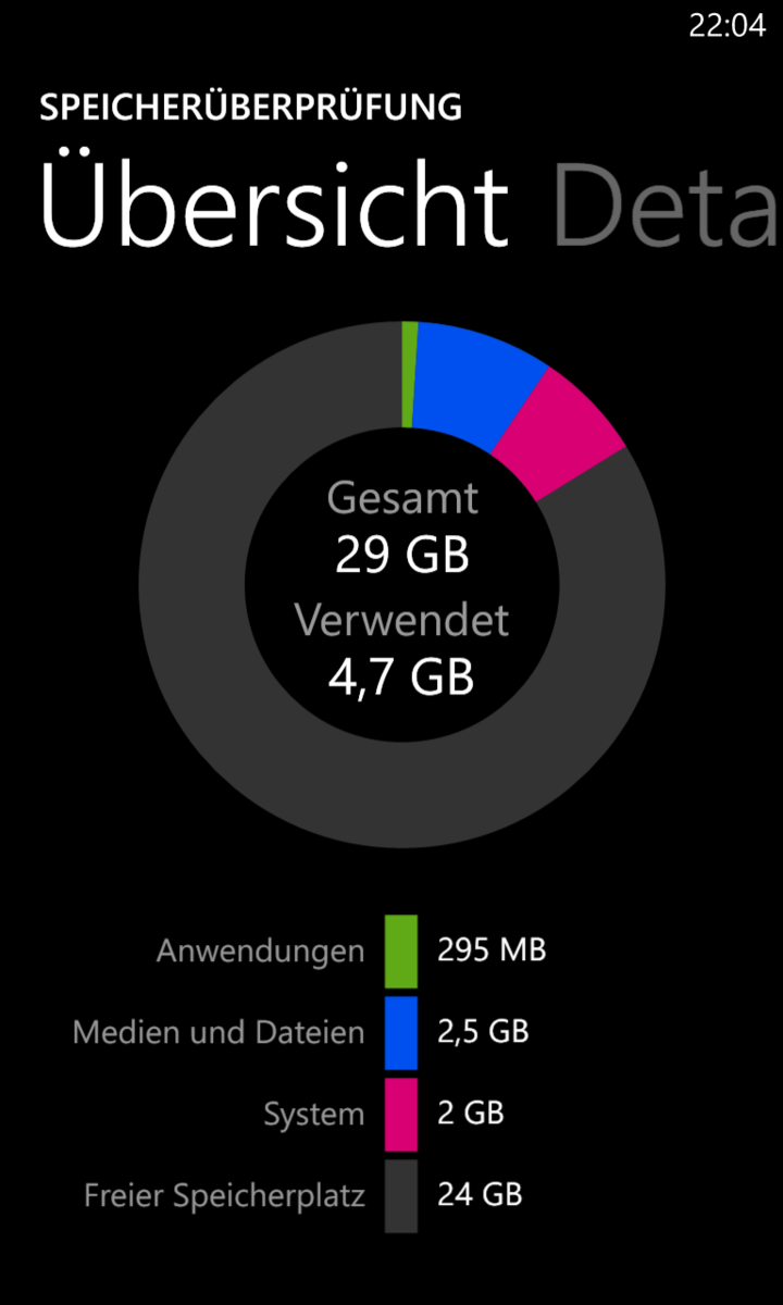 Der interne Speicher misst 32 GB und ist nicht erweiterbar. 2 GB sind für das System reserviert, sodass, laut „Speicherüberprüfung“, 29 GB zur freien Verwendung bereit stehen.