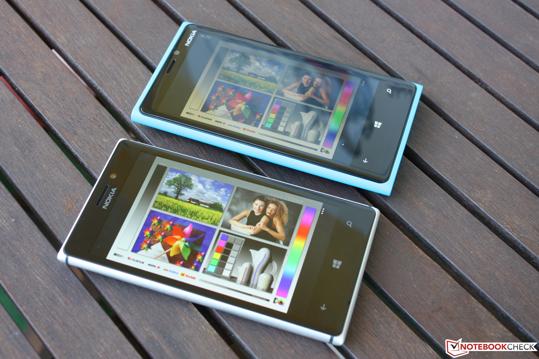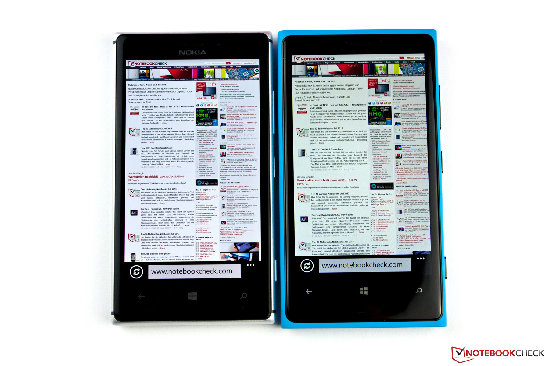 Die Panel-Helligkeit haben wir mit durchschnittlichen 292 cd/m² gemessen, bei einer Ausleuchtung von 90 Prozent. Das ist zwar im Vergleich zur Konkurrenz ein geringerer Wert, kann subjektiv aber durchaus überzeugen. Das Display des Lumia 920 (322 cd/m², 89 %) ist etwas heller, wirkt im direkten Vergleich aber dunkler (siehe Foto). Mit der Leuchtkraft des iPhone 5 (487 cd/m², 95 %) kann unser Testgerät nicht mithalten. Dazu sei aber angemerkt, dass die Helligkeit von AMOLED-Panels generell niedriger ist als die von LCD-Screens. Diese machen das Manko der geringeren Luminanz mit ihrem deutlich höheren Kontrast in der Regel wieder mehr als wett. So verfügt das Samsung Galaxy S4 ebenfalls über eine vergleichsweise geringe Helligkeit von 301 cd/m², dafür aber über einen absoluten Kontrast.