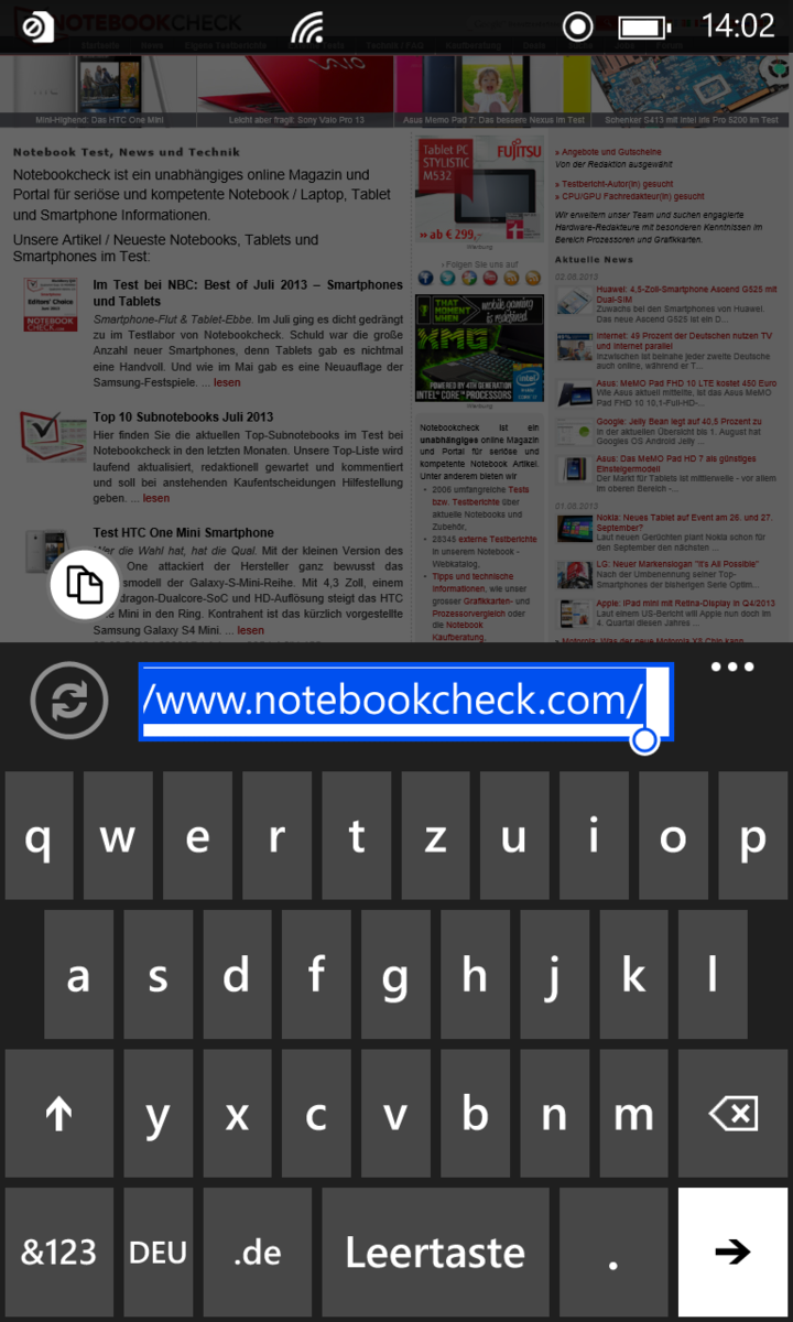 Texteingaben erfolgen über die virtuelle Tastatur. Hier hat sich im Vergleich zum Lumia 920 nichts geändert. Die Tastatur wirkt im Hochformat etwas gedrängt, dennoch werden überraschend wenig Tippfehler produziert. Im Querformat hingegen wird der Platz, den das Display bietet, nicht voll ausgenutzt, weshalb links und rechts Ränder entstehen.