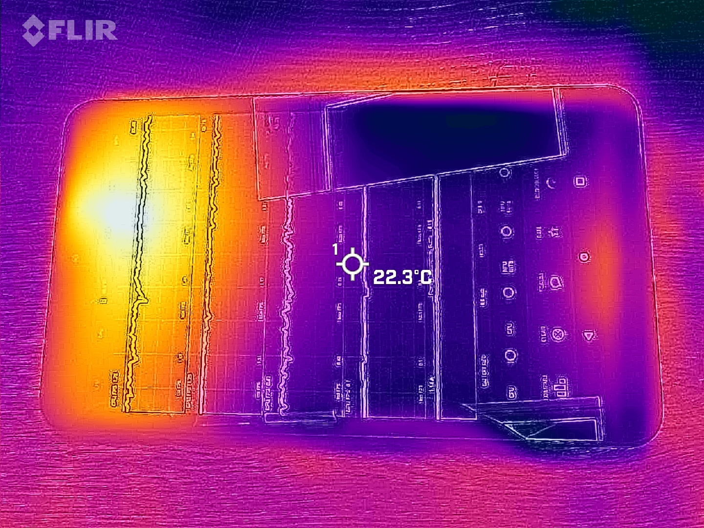 (+) Ohne Last messen wir eine durchschnittliche Temperatur von 22.7 °C auf der Oberseite. Der Klassendurchschnitt erreicht 30 °C.