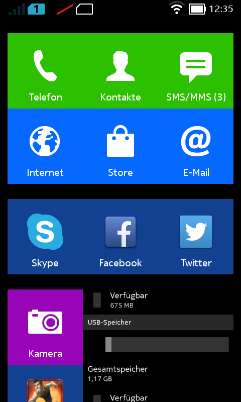 Die Bedienung ist relativ simpel gehalten und sollte auch für Smartphone-Neulinge keine große Herausforderung darstellen. Die Kacheln sind auch auf dem kleinen Screen angenehm groß dimensioniert und lassen sich gut bedienen. Alle installierten Apps werden auf dem Homescreen angezeigt und untereinander sortiert. Die Reihenfolge lässt sich beliebig ändern. Auch die Kachelfarbe lässt sich frei aus sechs vordefinierten Farben wählen. Live-Tiles, wie bei Windows Phone, gibt es aber nicht. Neben der kleineren Standard-Kachel ist es möglich jede Schaltfläche auf die vierfache Größe zu strecken. Um nicht die Übersicht zu verlieren, können Apps gruppiert werden.