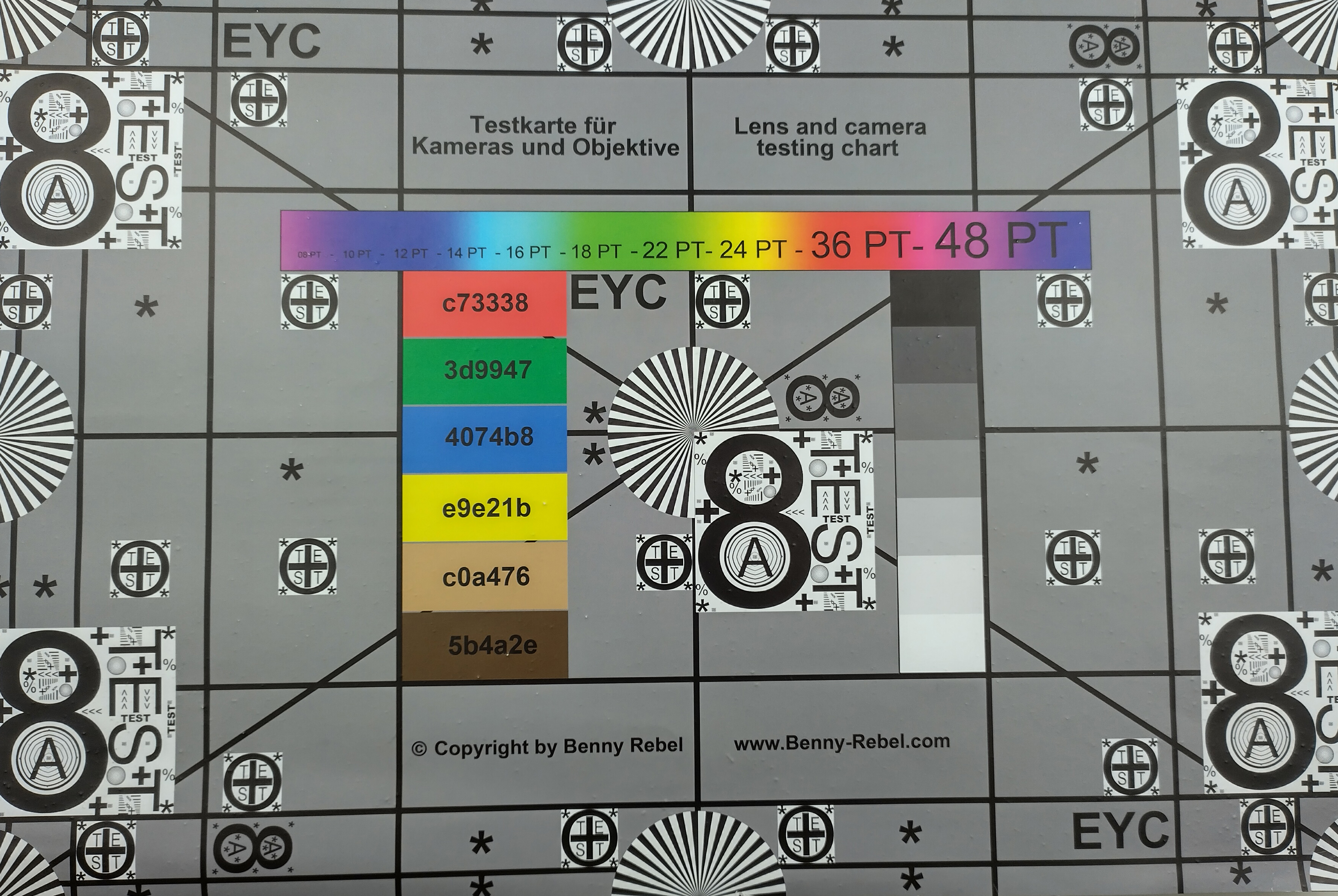 Hauptkamera BlumeHauptkamera UmgebungHauptkamera Low LightWeitwinkelobjektivBei festgelegten Belichtungsbedingungen im Labor fällt auf, dass der Kontrast innerhalb des Bildes nach oben rechts hin etwas abfällt. Schrift hebt sich deutlich von buntem Hintergrund ab, ist allerdings an den Rändern etwas unsauber. Größere Flächen zeigen teils Pixelrauschen.