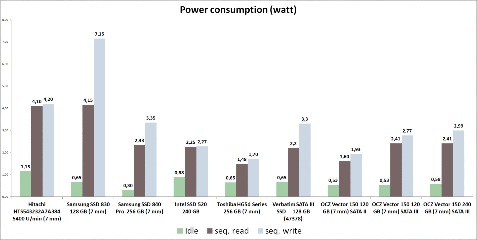 Für den Einsatz in Notebooks ist vor allem die Leistungsaufnahme der eingesetzten Komponenten von ausschlaggebender Bedeutung. Gegenüber konventionellen Festplatten können viele Solid State Drives in erster Linie unter Last von geringeren Stromverbräuchen profitieren. Toshiba hat mit der HG5d ein insgesamt sehr genügsames Laufwerk im Programm, das auch im Maximum lediglich 1,48 Watt und 1,7 Watt verbraucht. An diese Werte kommen beide Vector 150 mit 2,4 bis 2,99 Watt bei Weitem nicht heran. Anscheinend ist der Indilinx Barfoot 3 Controller unter Last deutlich energiehungriger als der Marvell Controller des Toshiba Laufwerks. Der verwendete 19-nm-MLC-Flash-Speicher von Toshiba, der bei beiden zum Einsatz kommt, dürfte jedenfalls kaum der Grund sein. Etwas umkehren können die Testmodelle das Verbrauchsbild im Leerlauf. Mit 0,53 bis 0,58 Watt gehört man hier zwar nicht zu den Spitzenreitern (0,27 Watt Samsung SSD 470), dennoch können viele andere Konkurrenten spürbar unterboten werden. Mit der 120-GB-Version haben wir auch Verbrauchsmessungen an einer SATA-II-Schnittstelle durchgeführt. Neben den zu erwartenden Geschwindigkeitseinbußen (max. 255 MB/s) verringert sich der Verbrauch unter Last recht drastisch.