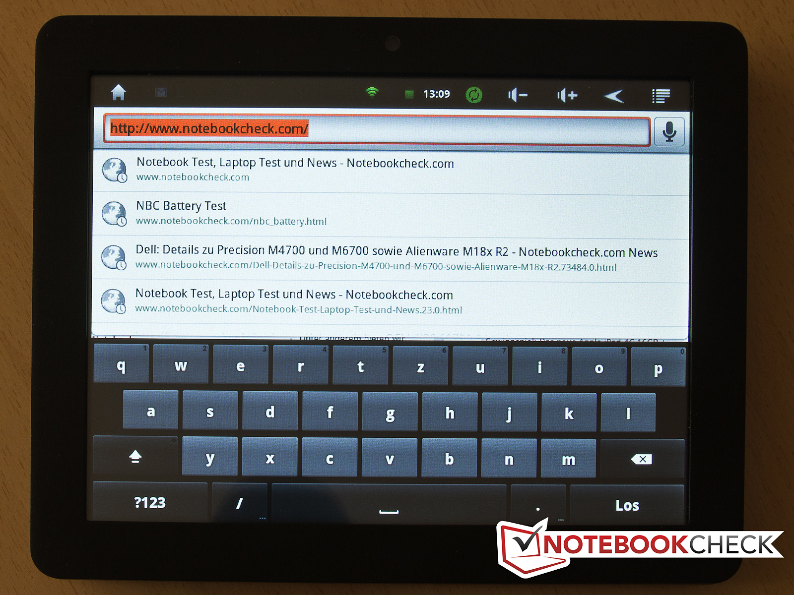 Natürlich besitzt das Tablet auch die virtuelle Android Tastatur. Das Schreiben mit der virtuellen Tastatur entpuppt sich aber als sehr fehleranfällig, da der resistive Touchscreen stellenweise sehr ungenau ist. Der mitgelieferte Stylus schafft hier zwar ein klein wenig Besserung, trotzdem kommt beim Schreiben viel Frust auf. Eine Kalibrierung hat nur wenig Besserung gebracht. Die Tastatur passt sich dem Hoch- oder Querformat an, andere Tastaturen stehen aber nicht zur Auswahl. Wie bei Android üblich, kann man an einigen Stellen alternativ zur Tastatur auch die Spracheingabe nutzen. Mit Suchbegriffen, die man bei Google eingibt, hat das im Test auch sehr gut funktioniert.
