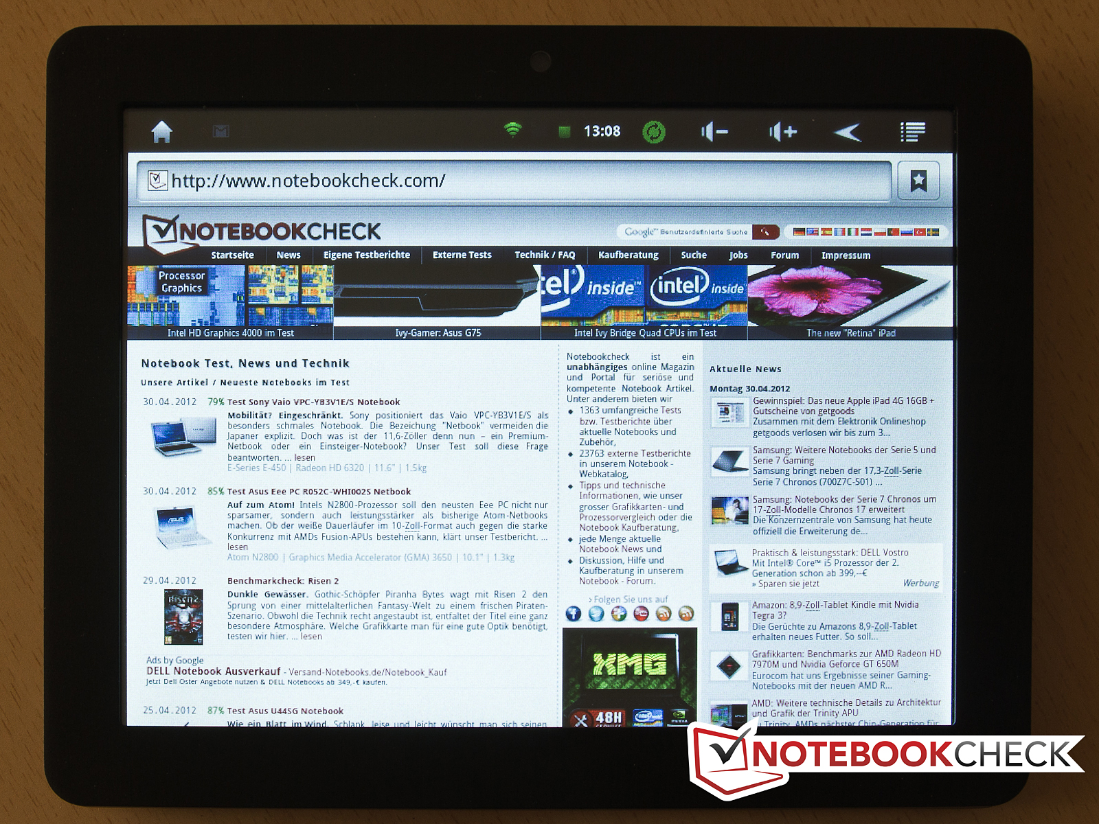 Das Display besitzt eine Auflösung von 800x600 Pixeln und ist im 4:3 Format gehalten. Das 7 Zoll Display besitzt einen resistiven Touchscreen. Zur Erinnerung, resistive Touchscreens reagieren auf Druck (das iPad beispielsweise beisitzt ein kapazitives Modell). Dadurch muss man immer relativ fest zudrücken, damit das Display die Eingabe erkennt. Die Eingabe ist somit nicht so flüssig und leichtgängig wie bei anderen Tablets. So kommt es einem immer etwas träge vor. Für ein mobiles Gerät, wie beispielsweise ein Tablet, ist das schon ein großes Problem. Von Multitouch, so wie auf der Packung angegeben, konnten wir anfangs nichts erkennen. Das Tablet hat in unserem Test nicht auf die Eingabe mit zwei Fingern reagiert. Erst nach einer erneuten Kalibrierung des Displays funktionierte Multitouch. Die Helligkeit des Displays ist zusätzlich nicht besonders hoch ausgefallen. Mit einer maximalen Helligkeit von 192 cd/m² ist das auch kein Wunder. Immerhin ist der Schwarzwert mit 0.3 cd/m² erfreulich niedrig. So ergibt sich immerhin noch ein Kontrast von 587:1.