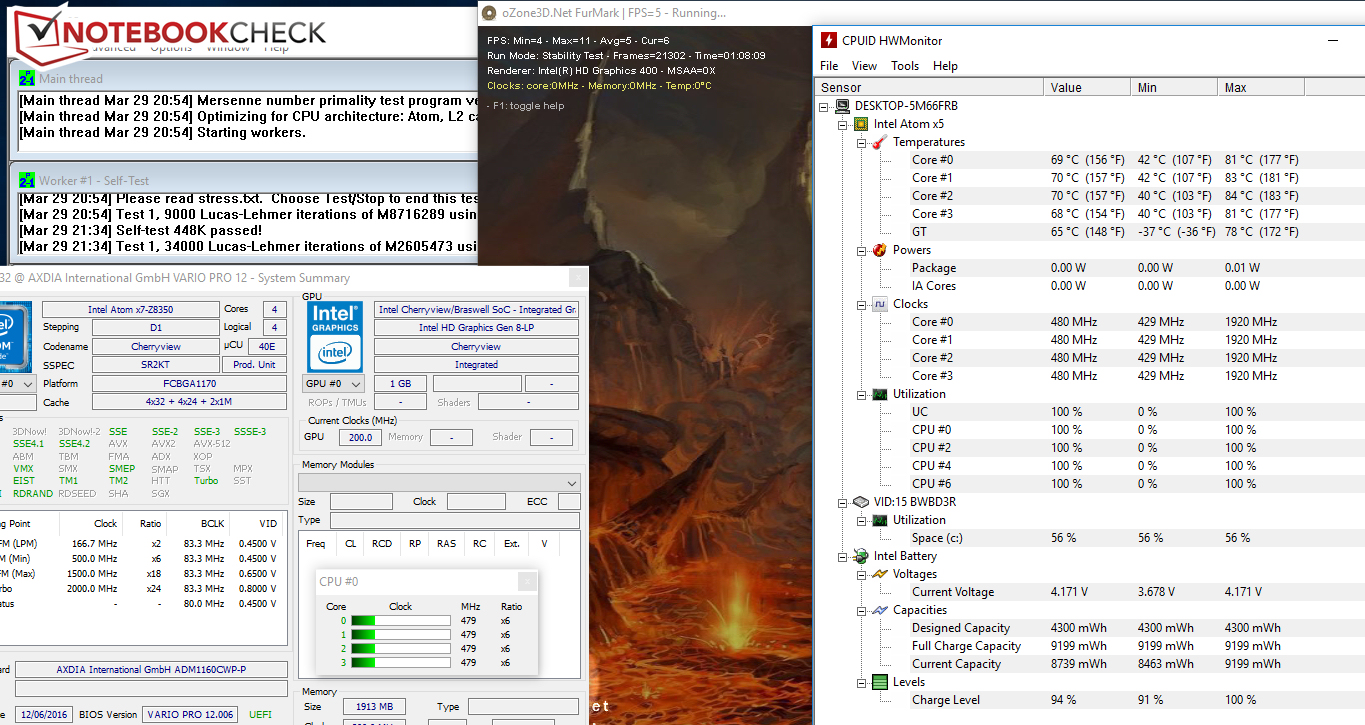 Im Inneren des Convertible ist Intels Atom x5 Z8350 (Cherry Trail) Vierkernprozessor anzutreffen. Der Prozessor ist zur Nutzung einfacher Anwendungen aus den Bereichen Office und Internet gemacht. Die niedrige TDP (kleiner 4 Watt) erlaubt eine passive Kühlung des SoC. Dies wird hier auch umgesetzt. Die CPU arbeitet mit einer Basisgeschwindigkeit von 1,44 GHz. Mittels Turbo ist eine Steigerung auf bis zu 1,92 GHz möglich. Die von uns durchgeführten CPU-Tests werden mit 1,7 GHz (Multi-Thread) bzw. 1,7 bis 1,92 GHz (Single-Thread) bearbeitet. Das Verhalten ist im Netz- und im Akkubetrieb identisch.