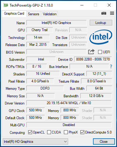 Die Grafikausgabe absolviert Intels HD Graphics GPU der Cherry-Trail-Generation. Diese unterstützt DirectX 12 und arbeitet mit Geschwindigkeiten von bis zu 500 MHz. Die Resultate in den 3D Mark Benchmarks bewegen sich auf einem normalen Niveau für diese GPU.