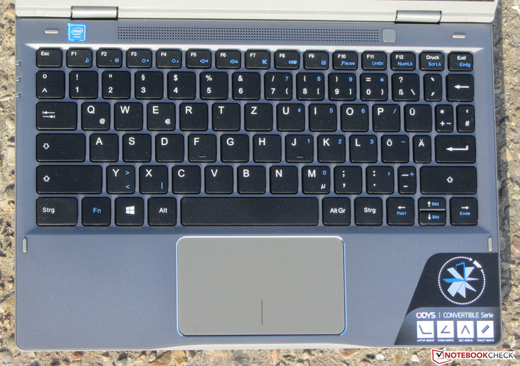 Odys stattet das Vario Pro mit einer unbeleuchteten Chiclet-Tastatur aus. Die flachen, leicht angerauten Tasten verfügen über einen kurzen Hub und einen klaren Druckpunkt. Der Anschlag dürfte für unseren Geschmack aber knackiger ausfallen. Während des Tippens gibt die Tastatur allenfalls minimal nach. Als störend hat sich das nicht erwiesen. Alles in allem liefert Odys hier eine Tastatur, die den Anforderungen an den Hausgebrauch genügt. Das multitouchfähige Clickpad nimmt eine Fläche von etwa 9,7 x 5,6 cm in Beschlag. Somit steht genügend Platz zur Nutzung der Gestensteuerung bereit. Die glatte Padoberfläche macht den Fingern das Gleiten leicht. Das Pad reagiert auch in den Ecken auf Eingaben. Es verfügt über einen kurzen Hub und einen klaren Druckpunkt.