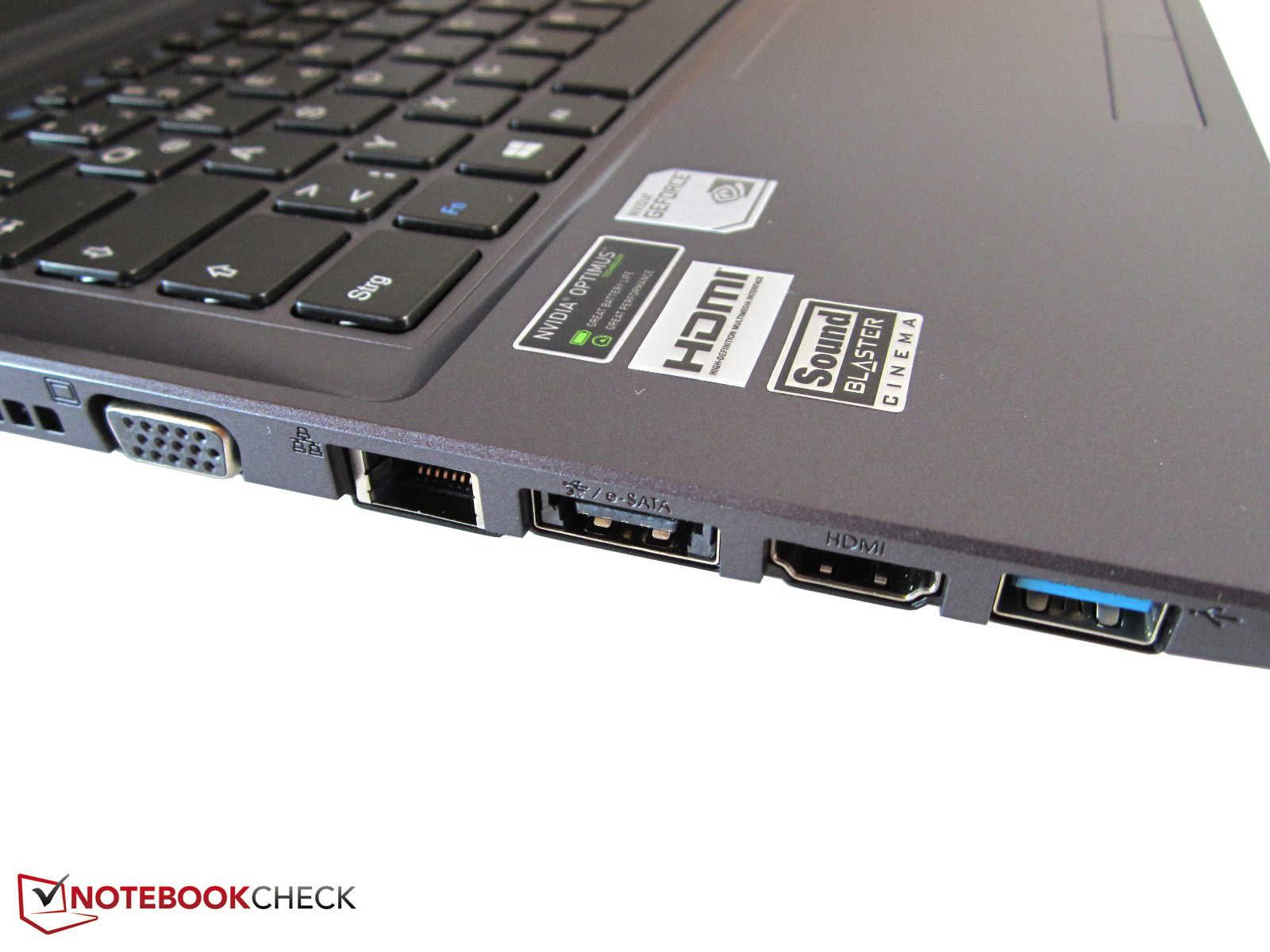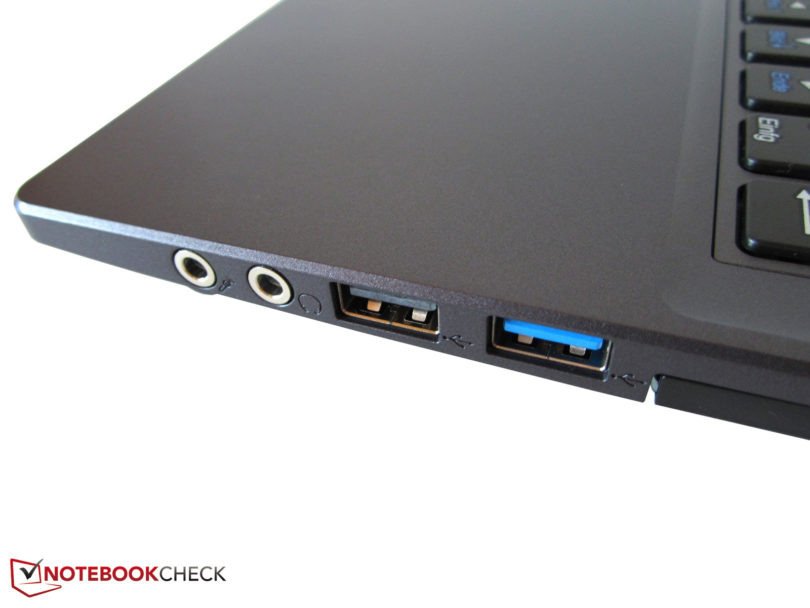 Die Anschlussausstattung ist weder mager noch üppig, sondern orientiert sich am üblichen Multimedia-Standard. Während die Rückseite – bis auf den Akku – komplett frei bleibt und die Vorderseite lediglich einen 9-in-1-Kartenleser enthält, kann die rechte Seite mit einem Kensington Lock, einem USB-3.0-Port, einem USB-2.0-Port und zwei Audio-Buchsen (Kopfhörer + Mikrofon) punkten.
