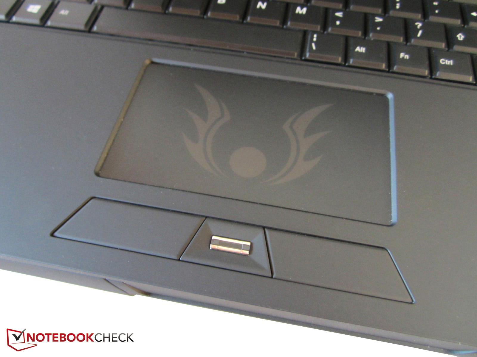 Neben der beleuchteten Tastatur sticht vor allem das beleuchtete Touchpad ins Auge. Wie uns One im Vorfeld mitgeteilt hat, werden die Serienmodelle eventuell kein Tribal-Symbol, sondern ein anderes Motiv enthalten. Die Hochglanzleiste unter den Scharnieren ist ebenfalls Geschmackssache. Gerade die Lautsprechergitter wirken vom Design nicht unbedingt hochwertig. Außerdem entpuppt sich die Leiste als recht empfindlich (Stichwort Fingerabdrücke). Immerhin hat sich Clevo die nervige Soundanzeige des 17-Zoll-Bruders P177SM gespart. Zwischen den Lautsprechergittern befinden sich nur ein paar Statuslämpchen.