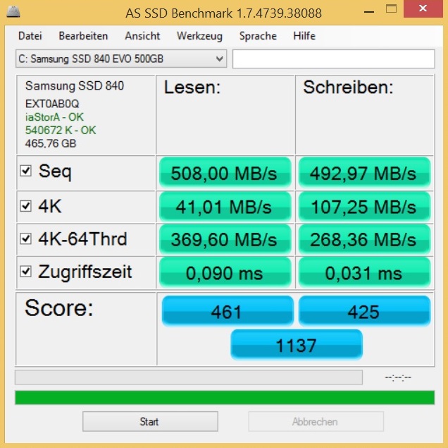 Die 500-GByte-Version, von der auch unser Testgerät angetrieben wurde, brilliert in beinahe jeder Hinsicht. Sei es nun die Leistung bei kleinen Dateien oder die sequentielle Lese- und Schreibrate. Maximal 508 bzw. 493 MB/Sek deuten auf ein topmodernes Innenleben hin. Viele 2,5-Zoll-Konkurrenten schreiben Daten mit höchstens 300-400 MB/Sek (z.B. die 840 Basic im One K73-3N). Als Zugriffszeit gab der AS SSD Benchmark 0,09 respektive 0,03 ms aus, was ein typischer Wert für die 840 EVO ist (man vergleiche das Notebookguru Earth V).