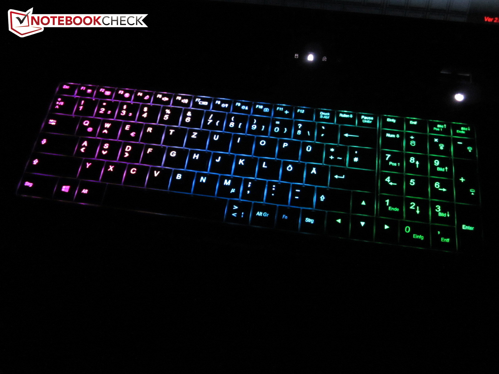 Die Eingabegeräte hinterlassen einen zwiespältigen Eindruck. Auf der positiven Seite wäre die in drei Zonen beleuchtete Tastatur zu nennen, welche sich – mit Ausnahme des gewöhnungsbedürftigen Layouts – keine Patzer erlaubt. Auf der negativen Seite hätten wir das schwammige und nicht sonderlich stabile Touchpad, dessen Hochglanzoberfläche ein angenehmes Arbeiten verhindert. Der mehrmals genannte XMG P723-Artikel beschäftigt sich ausführlicher mit dieser Kategorie.