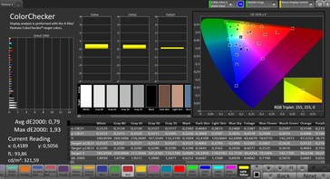 In den Werkseinstellungen (Profil: Natur) wird der vergleichsweise kleine sRGB-Farbraum größtenteils abgedeckt. Die Darstellung der Farben ist äußerst akkurat, bei sehr geringen DeltaE-Werten. Auch die Grautöne weisen keinerlei Farbverfälschungen auf.