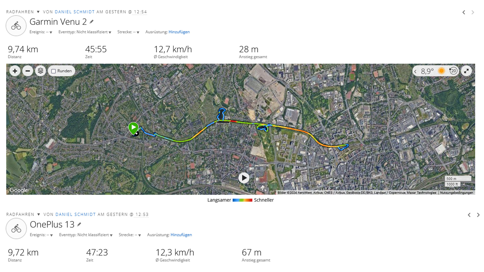 Um Aussagen über die Ortungsgenauigkeit via Satelliten treffen zu können, genehmigen wir uns eine kurze Runde mit dem Fahrrad und nehmen die Garmin Venu 2 als Vergleichsgerät mit. Die Positionsbestimmung des OnePlus 13 erfolgt bestenfalls mit Dual-Band-GNSS. Der Satfix gelingt uns sehr zügig und auch innerhalb von Gebäuden ist das GNSS-Modul äußerst präzise.