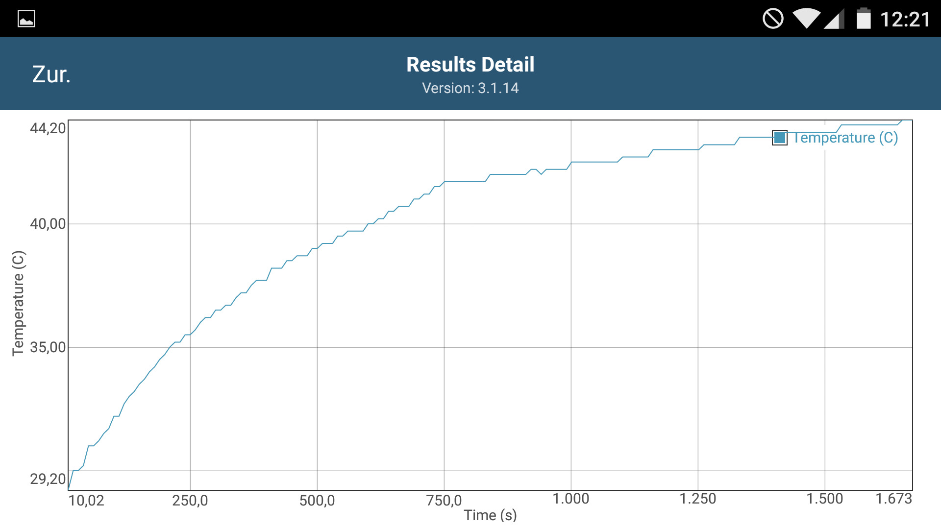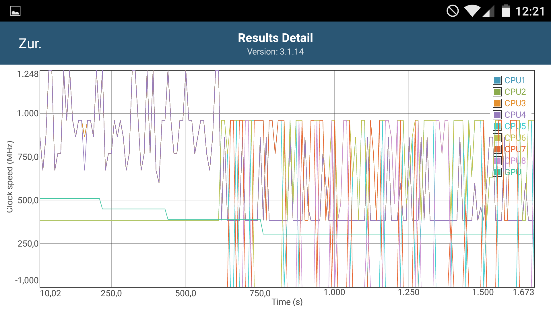 Mit dem Akkutest des GFXBench 3.1 haben wir die Wärmeentwicklung des SoCs überprüft. Dabei wird der Open GL ES 2.0-Test T-Rex dreißigmal hintereinander ausgeführt und die Daten des Smartphones protokolliert. Hier zeigt sich schön, dass die Optimierung des Snapdragon 810 die Performance-Einbußen unter Last zwar dauerhaft nicht verhindern kann, die Leistung aber länger auf einem hohen Niveau bleibt. Dennoch bricht die Leistung nach etwa der Hälfte des Tests um fast 50 Prozent ein. Ein spürbares Throttling gibt es also dennoch.
