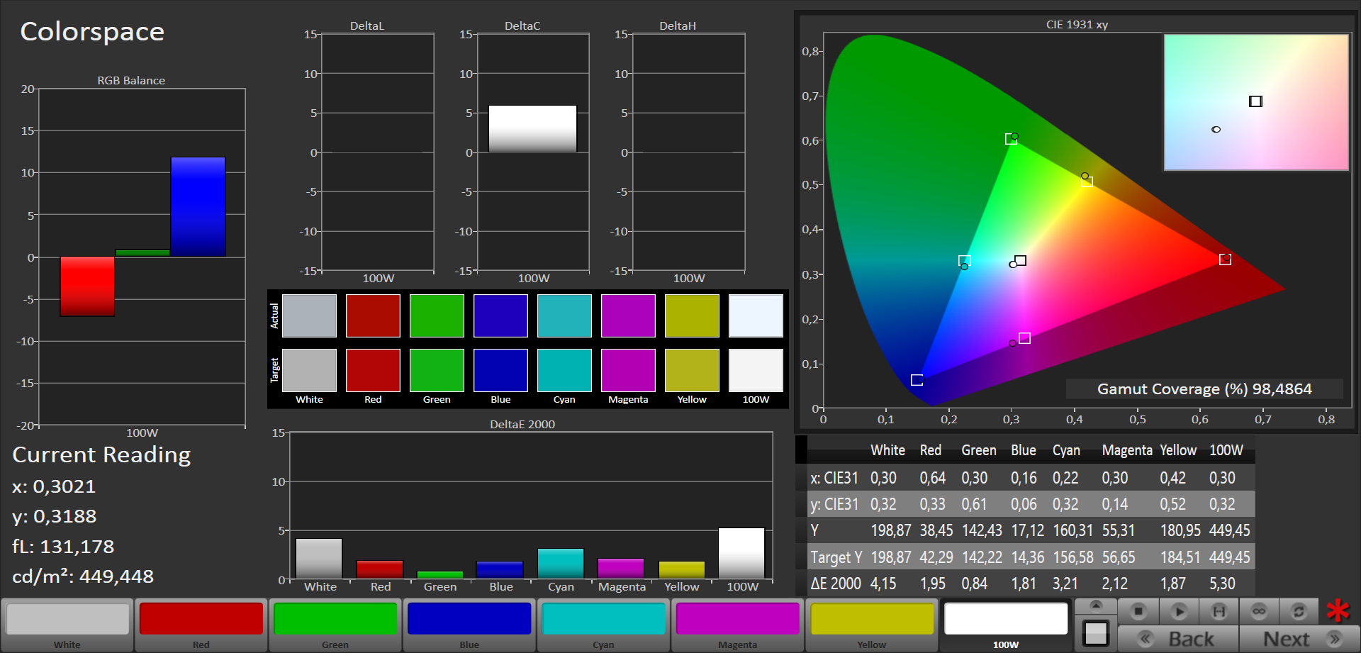 | Helligkeit Bildmitte (cd/m²) | 451 | 423 -6% | 474 5% | 343 -24% | 453 0% | 566 25% | 519 15% | 442 -2% |