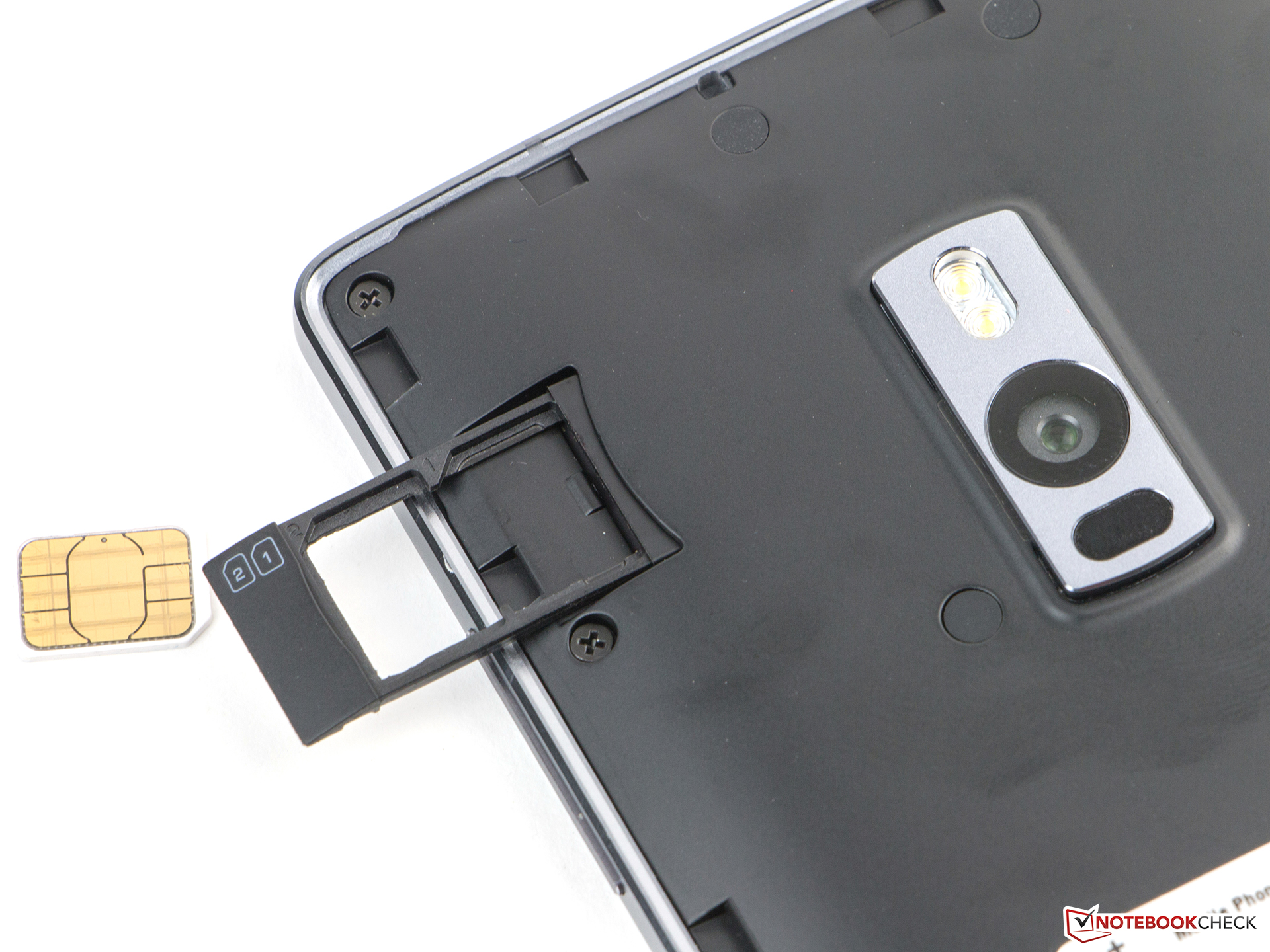 Die Wertigkeit wurde durch den Einsatz des Aluminiumrahmens erhöht und wirkt edler. Leider ist das Display nicht mit eingefasst worden, sodass auf dem Alurahmen ein zusätzlicher aus Kunststoff ruht. Im Gegensatz zum OnePlus One ist der SIM-Slot nun nicht mehr an der Seite untergebracht, sondern verbirgt sich unter der abnehmbaren Rückseite. Es handelt sich dabei um einen Dual-SIM-LTE-Slot, welcher zwei Nano-SIMs akzeptiert. Das Entfernen des Back-Covers wird durch eine kleine Einkerbung erleichtert. Da es sehr fest sitzt und das Cover dünn ist, hat man schon ein wenig Sorge, dass man etwas beschädigen könnte. Passiert ist unserem Testgerät aber nichts. Die wechselbare Rückseite kann neben der Sandstone Black-Oberfläche auch in anderen Designs erworben werden, wozu auch Kevlar und diverse Holzarten gehören. Erstere fühlt sich wie feines Schmirgelpapier an und lässt das Smartphone sehr griffig wirken.