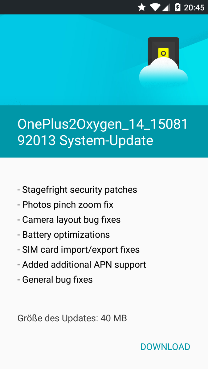 Bereits wenige Tage nach Erscheinen des OnePlus 2 gab es ein Update auf Oxygen 2.0.1, welches Bugfixes einspielt, die Stagefright-Lücke schließt und einige kleine Verbesserungen implementiert.