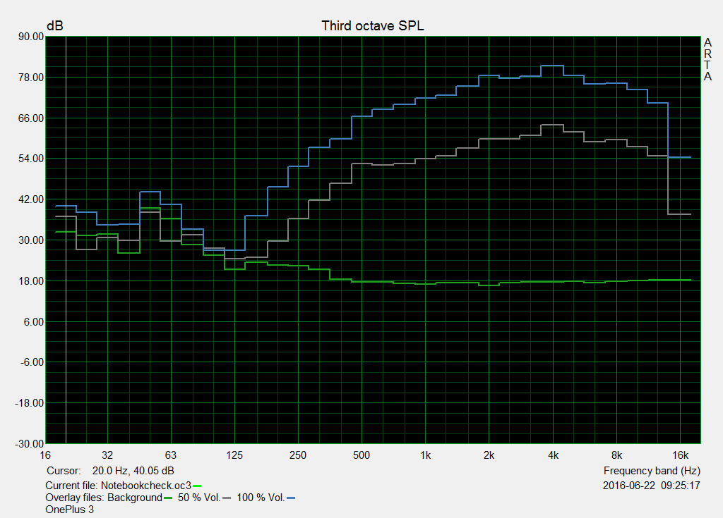 Mit bis zu 88,6 dB(A) kann das OnePlus 3 richtig laut werden, leider bleibt die Klangqualität dabei auf der Strecke. Wie das Pink-Noise-Diagramm zeigt, werden die einzelnen Frequenzen nicht sonderlich linear wiedergegeben. Bässe sind gar nicht vorhanden, und die Mitten sind schwach, aber bei 50 Prozent der Lautstärke zumindest zwischen 500 und 1.000 Hz recht linear. Wer voll aufdreht, wird dies zunichtemachen. Auch subjektiv wirkt der Klang nicht ausgeglichen und wird von einem hörbaren Grundrauschen begleitet.