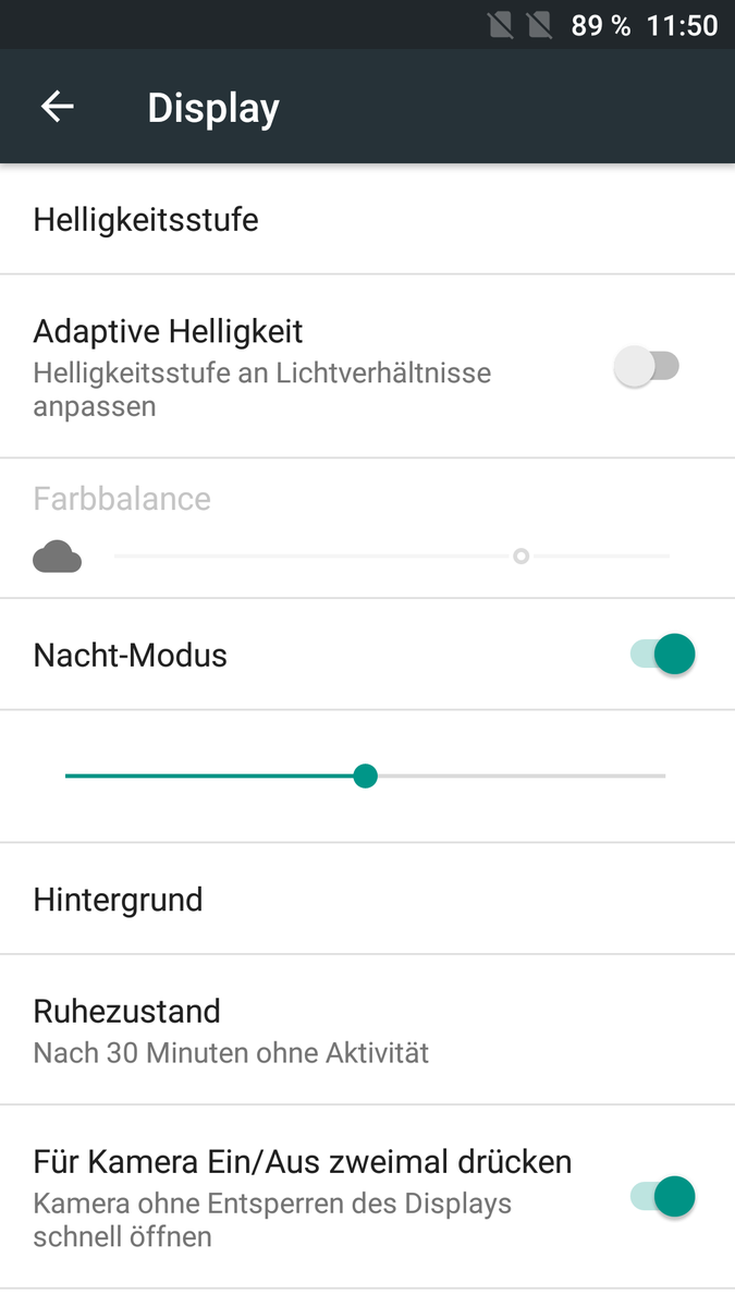 Anders als in den Samsung Smartphones gibt es keine Farbprofile im OnePlus 3, stattdessen lässt sich nur die Farbbalance regeln. Diese ist von Werk aus mit einem leichten Blaustich versehen, was für eine kühle Bilddarstellung sorgt. Wer es möglichst natürlich mag, sollte den Regler auf Maximum stellen, dann hat das Panel zwar einen hauchfeinen Lilastich bei der Darstellung von hellen Flächen, dieser fällt im Alltag aber nicht auf.