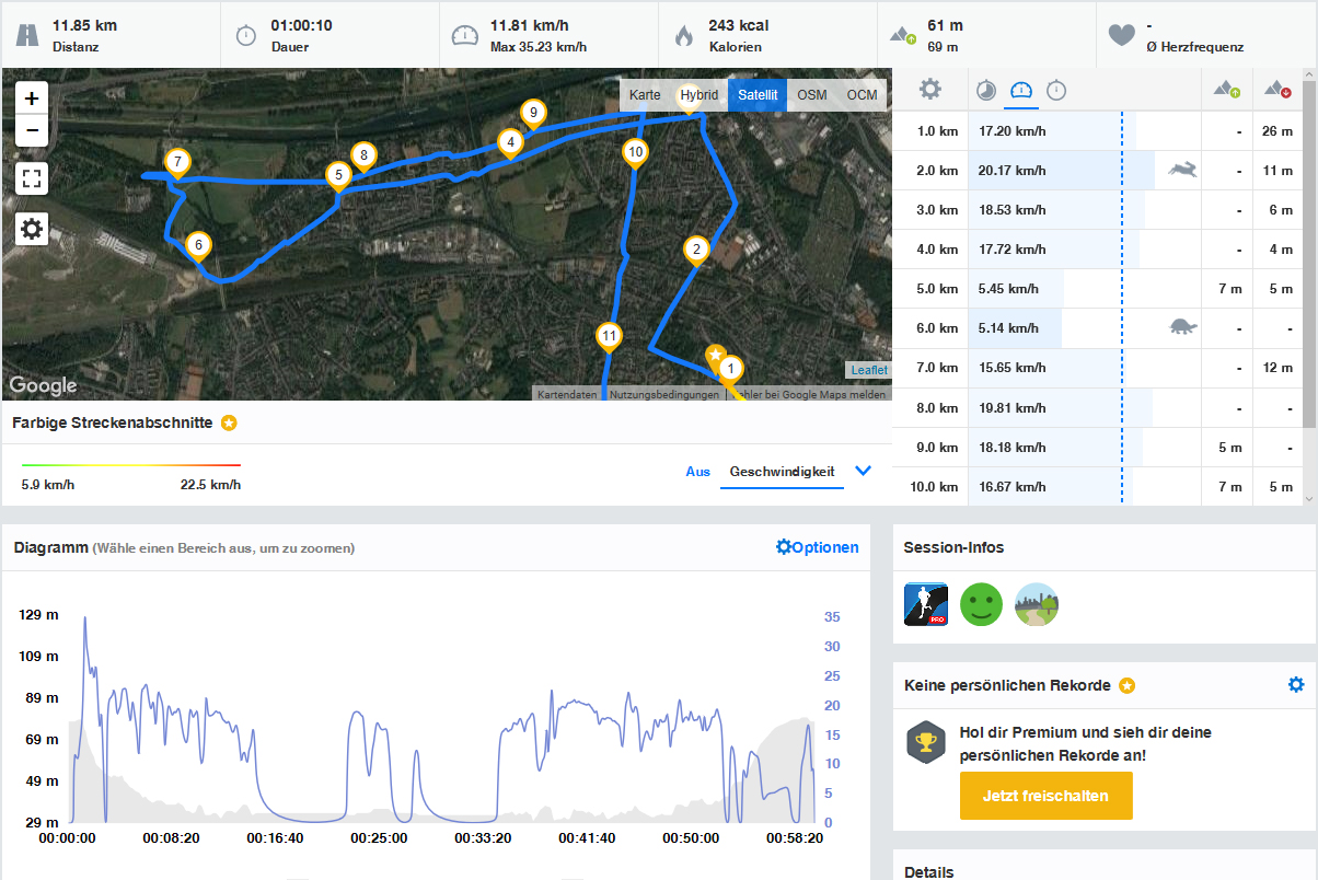 Das sagt aber noch nicht wirklich etwas aus darüber, wie sich das Smartphone im wahren Leben schlägt. Hierfür packen wir das OnePlus 5 in einen Rucksack und nehmen ebenfalls das Garmin Edge 500, ein Navigationsgerät speziell für Radfahrer, mit auf eine Mountainbike-Tour. Die gemessene Wegstrecke stimmt schon mal fast exakt überein, sehr gut. Tatsächlich begeistert das OnePlus 5 auch bei der Genauigkeit der Wegführung, nur ganz selten muss eine gerade Linie zwischen zwei weiter entfernten Punkten gezogen werden. Das Garmin Edge 500 misst natürlich noch genauer, aber die Leistung des GPS-Moduls im OnePlus 5 ist dennoch beeindruckend.