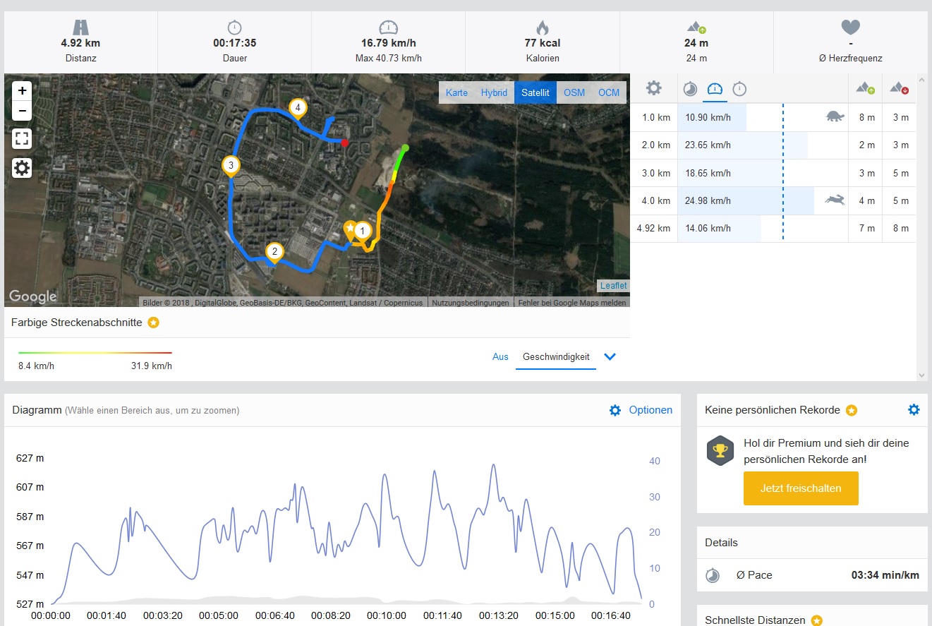 Wir machen eine Radtour mit dem OnePlus 6 und nehmen auch das Profi-Navi Garmin Edge 520 zum Vergleich mit. Hier zeigt sich das OnePlus 6 sehr souverän und ortet uns im Bereich der Fußgänger- und Radbrücke mit der runden Auffahrt zwar nicht perfekt, aber wesentlich besser als das Profi-Gerät. Auch den Hin- und Rückweg zur Brücke beschreibt das OnePlus 6 recht genau, während sich das Garmin-Navi hier verfranst.