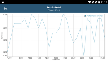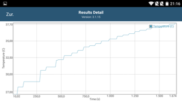 Wie sich die Wärmeentwicklung am SoC verhält, haben wir mit dem Akkutest des GFXBench 3.1 überprüft. Dabei wird der T-Rex-Test dreißigmal in Folge ausgeführt und sowohl der Akkustand als auch die Framezahl werden protokolliert. Die Wärme wird prima nach außen abgeleitet. Am SoC bleiben die Temperaturen zu jeder Zeit unter 38 °C und das OnePlus X kann konstant seine Leistung abrufen.