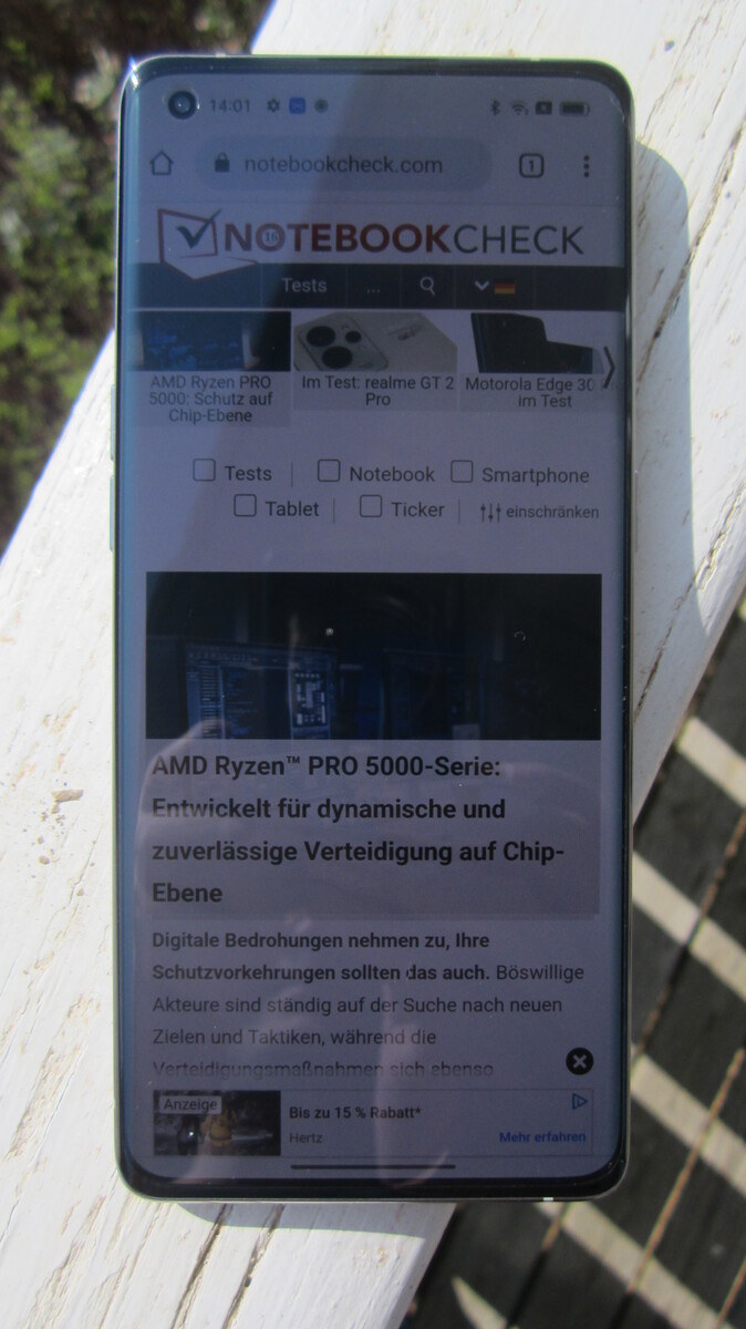 Laut Hersteller soll der Bildschirm eine Spitzenhelligkeit von 1000 cd/m² erzielen, doch im Test bleibt er mit maximal 813 cd/m² bei der APL50-Messung ein gutes Stück darunter. Dennoch ist die Luminanz mit aktiviertem Helligkeitssensor wirklich gut – im Durchschnitt sind es rund 718 cd/m². Auch Displayfläche leuchtet das Oppo mit 95% dann sehr gut aus. Ohne Helligkeitssensor schafft der Bildschirm maximal 500 cd/m². Auf minimalster Helligkeitsstufe leuchtet er noch mit 2,14 cd/m².