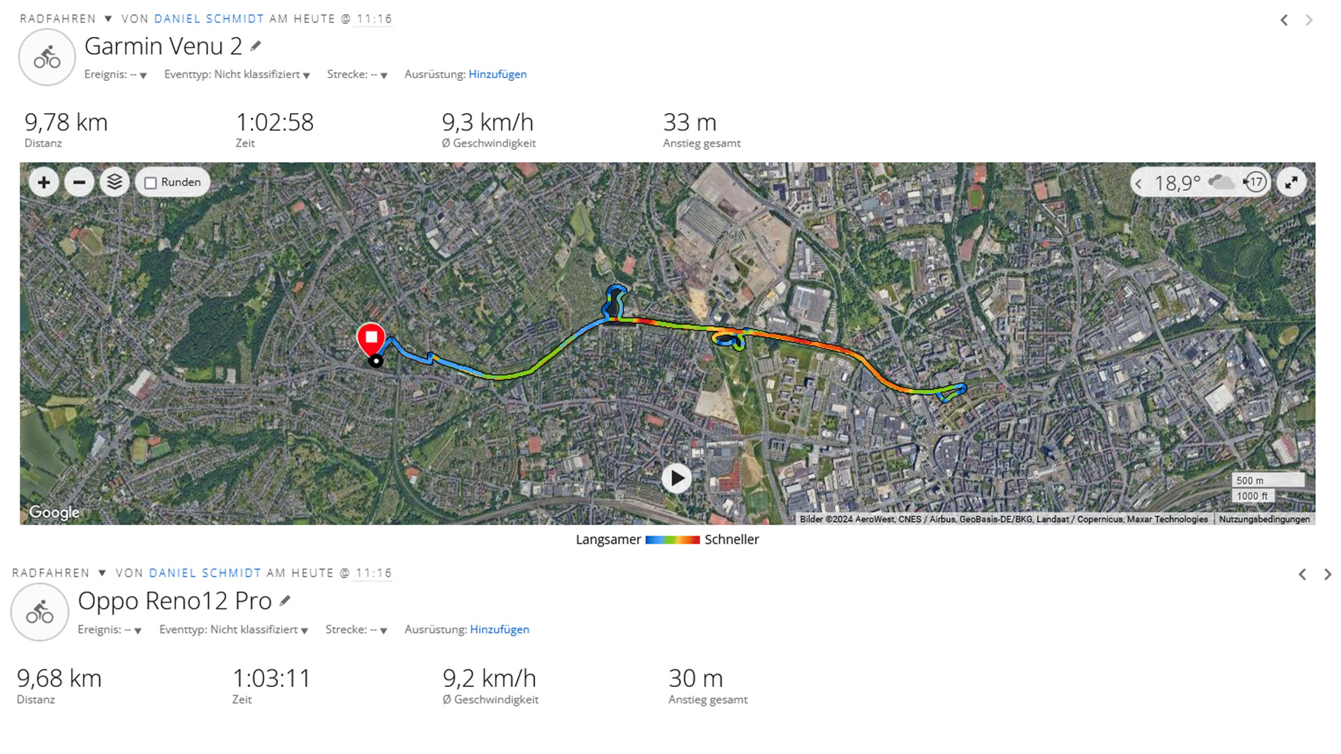 Alle gängigen Satellitensysteme werden vom Reno12 Pro unterstützt, inklusive SBAS, allerdings nur als Single-Band. Die Genauigkeit des Systems lässt zu wünschen übrig. Auf einer gemeinsamen Radrunde mit einer Garmin Venu 2 fällt auf, dass die aufgezeichnete Route des Smartphones teilweise nicht auf Straßen verläuft, das tritt besonders in bebauten Gebieten auf.