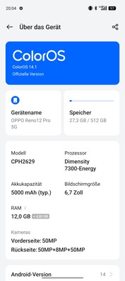 Oppo liefert das Reno12 Pro mit Android 14 und der eigenen UI ColorOS 14 aus. Zum Testzeitpunkt ist der Sicherheitspatch vom Juli 2024 und damit ziemlich aktuell. Im Verlauf des Test kam ein 1 GB großes Update mit einigen zusätzlichen AI-Funktionen.