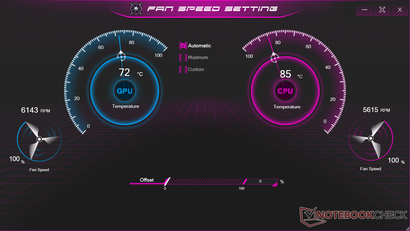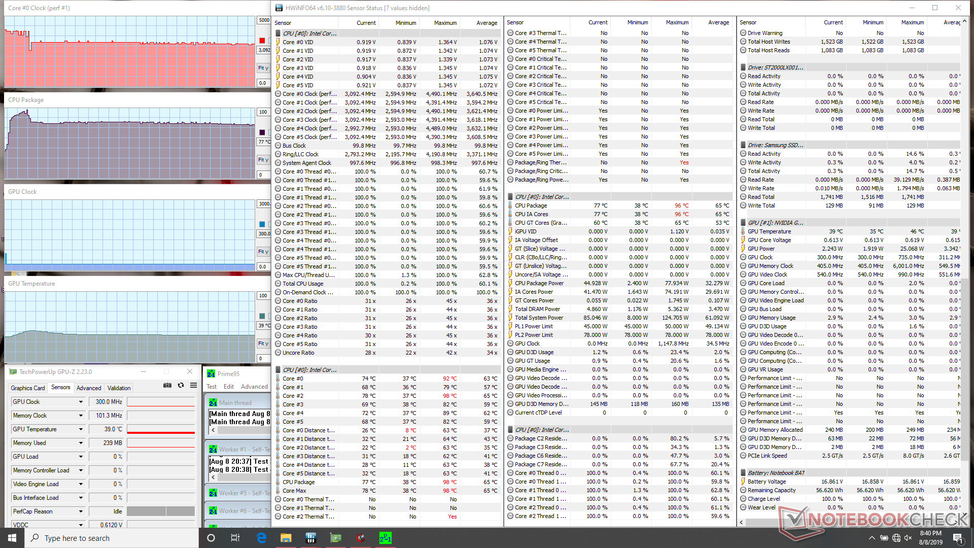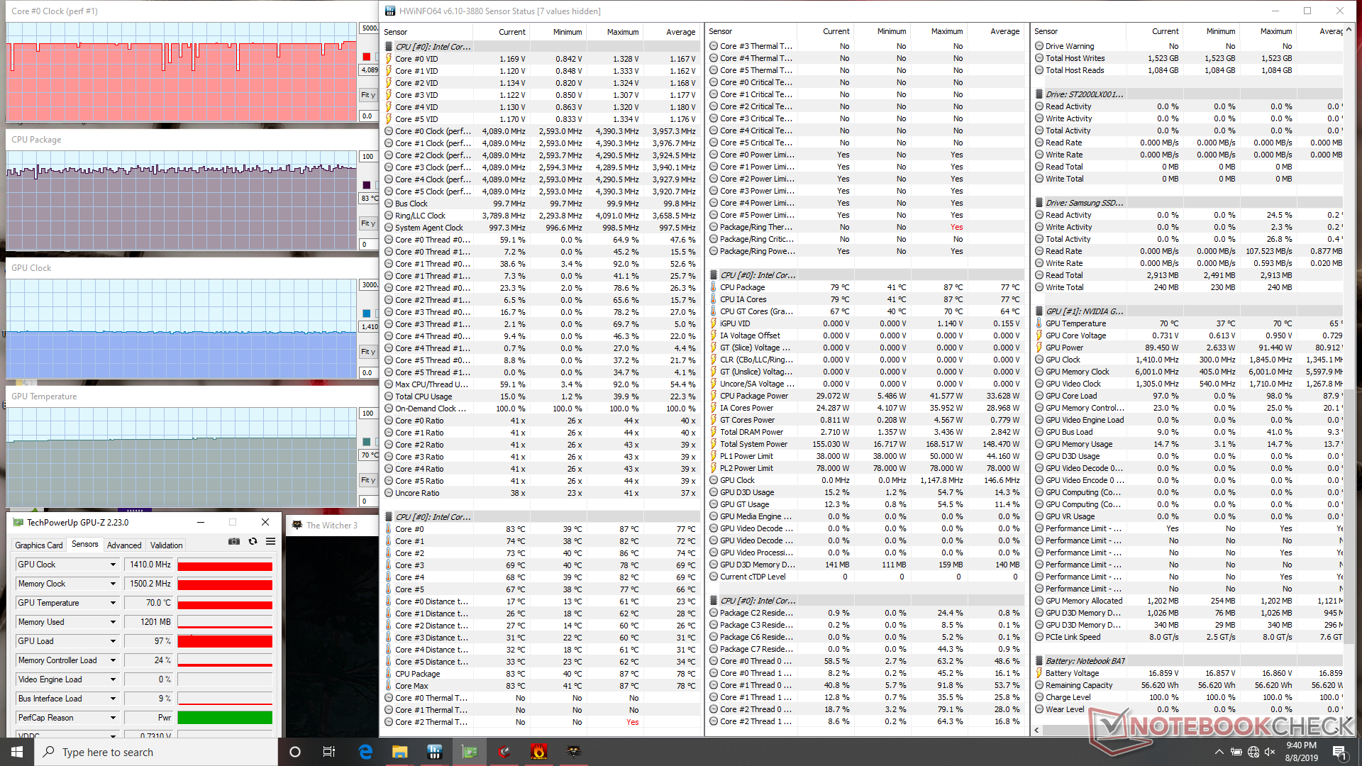 Das Spielen von The Witcher 3 repräsentiert praktische Gaming-Lasten jedoch besser. Hier stabilisieren sich CPU und GPU bei 83 °C bzw. 70 °C, wohingegen die Temperaturen des Blade 15, das mit der gleichen RTX 2080 Max-Q Grafikkarte ausgestattet ist, bei 79 °C bzw. 69 °C liegen. Auch unter hoher Last muss das System weder CPU noch GPU drosseln.