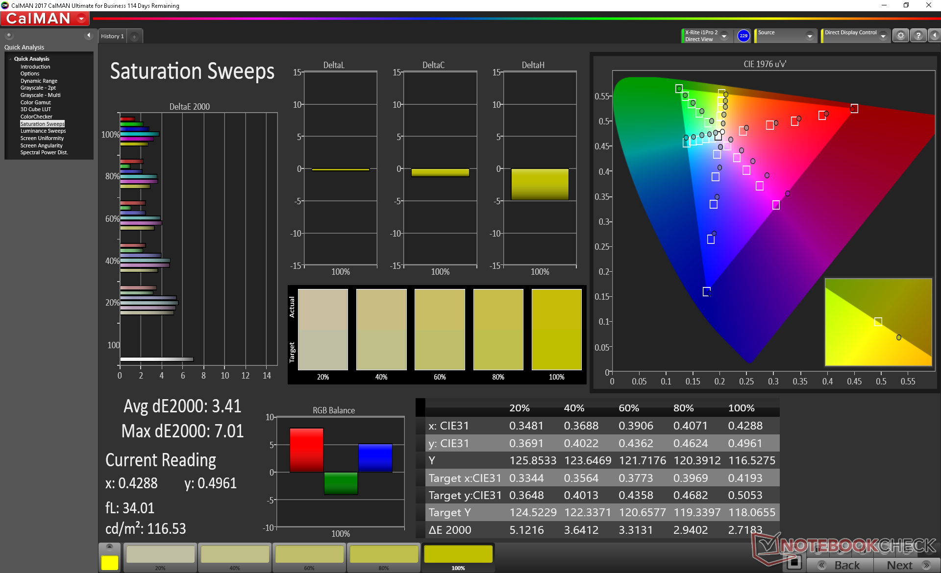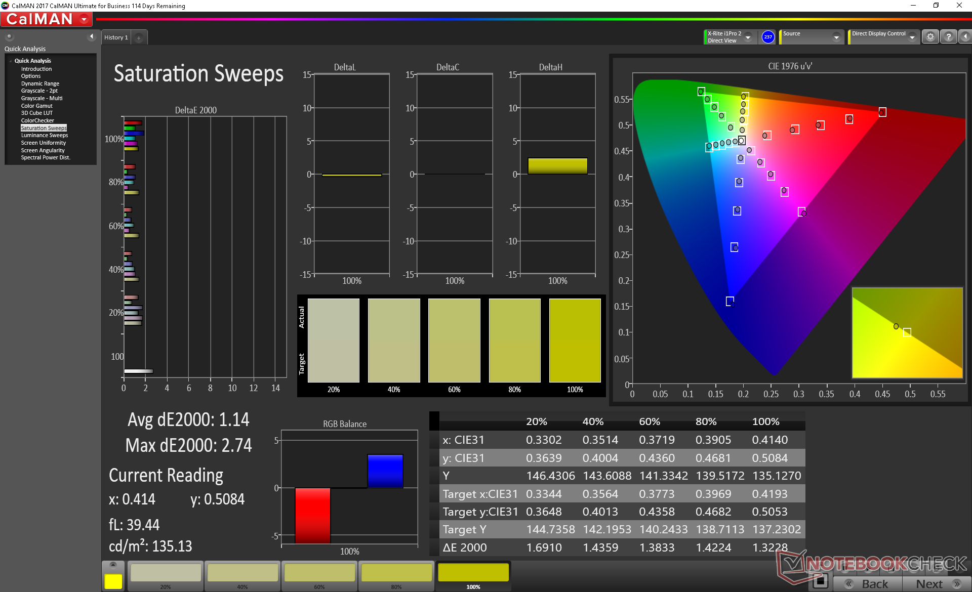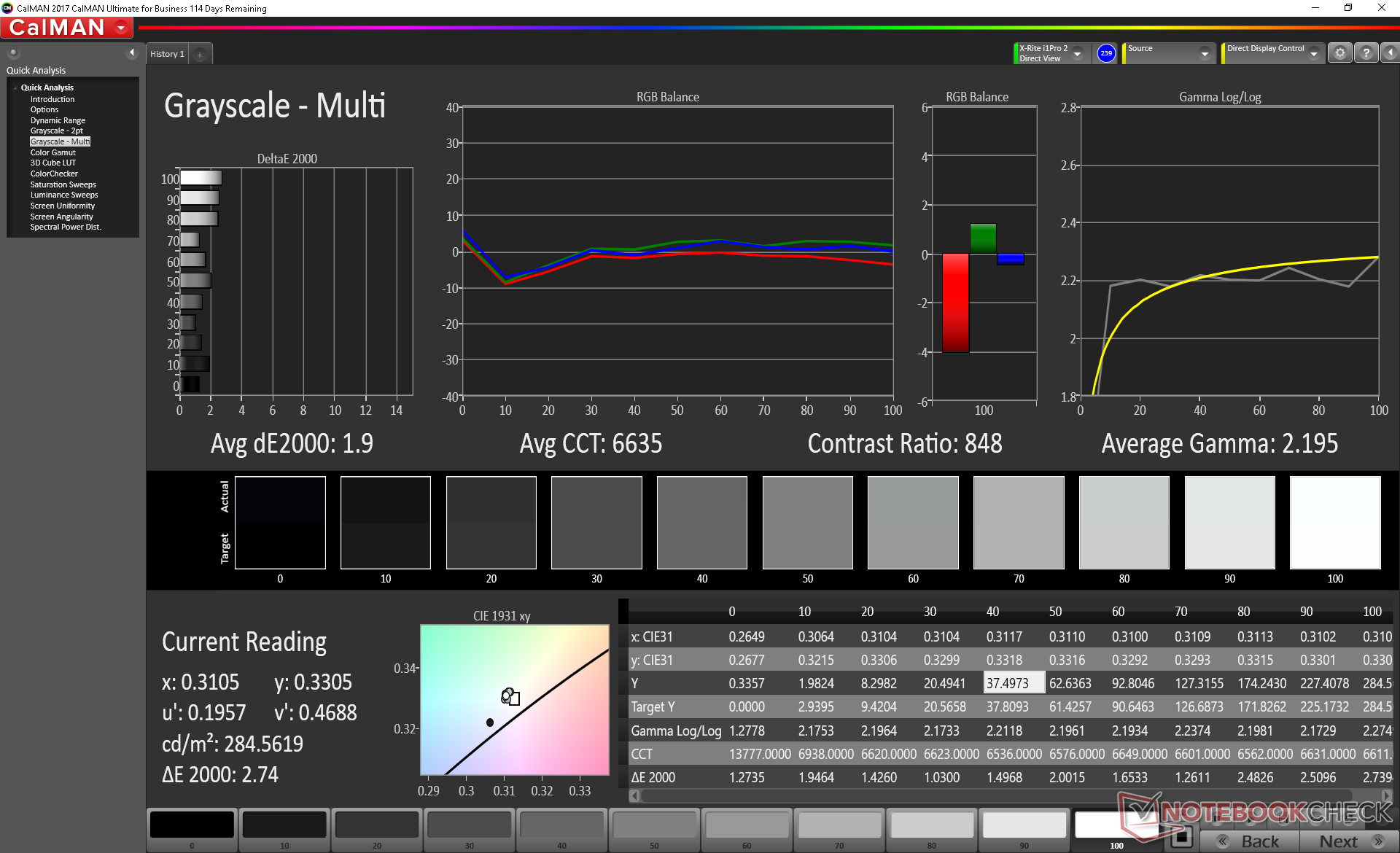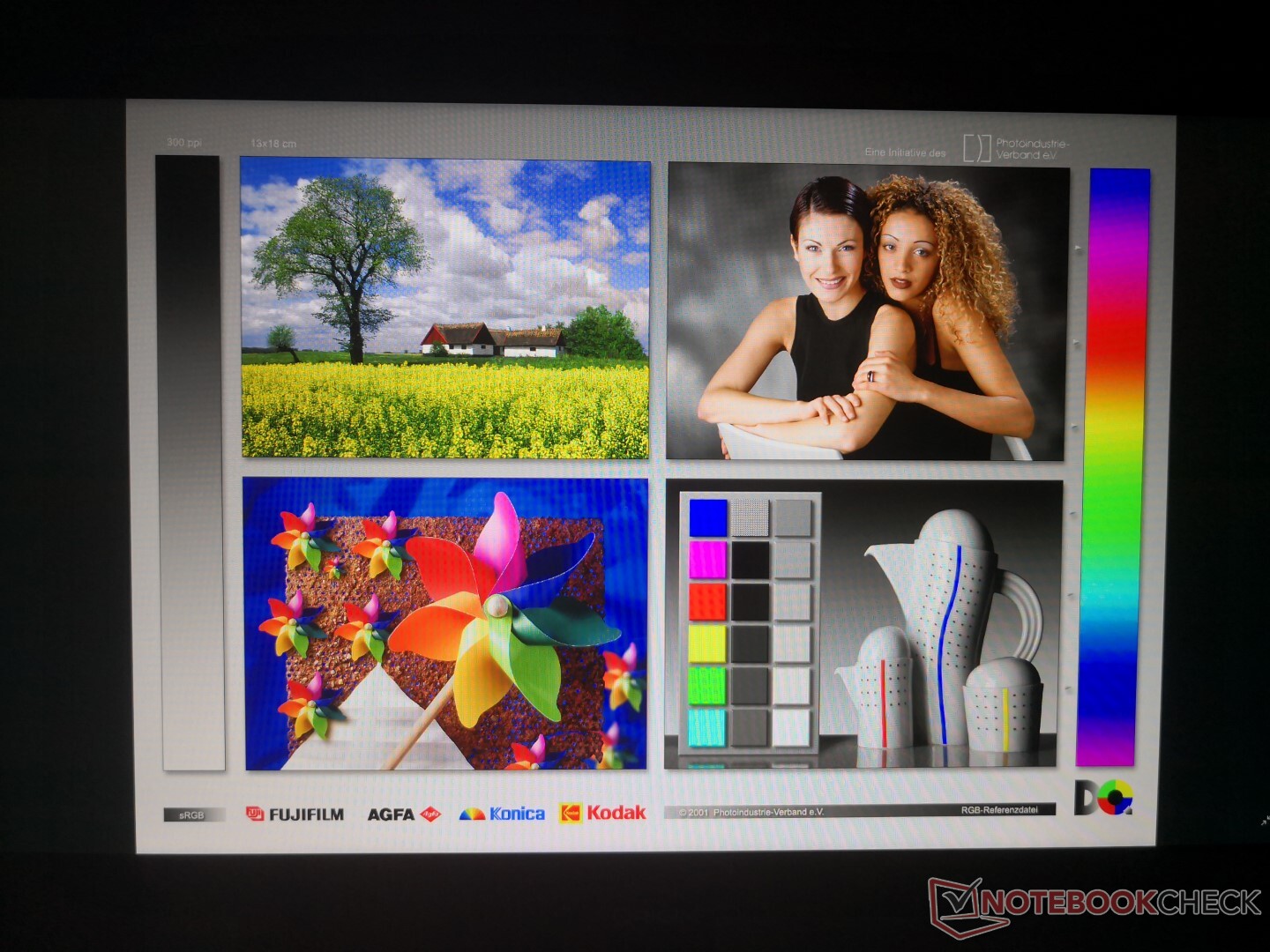 Weitere Messungen mit einem X-Rite-Farbmessgerät offenbaren die ab Werk nur durchschnittlichen Graustufen und die durchschnittliche Farbgenauigkeit. Auch die Farbtemperatur ist zu warm, allerdings kann dies mittels einer Kalibrierung behoben und die Genauigkeit der Darstellung damit sichtlich verbessert werden. Die durchschnittlichen DeltaE-Werte für die Graustufen und Farben liegen nach der Kalibrierung bei nur 1,9 bzw. 1,14.