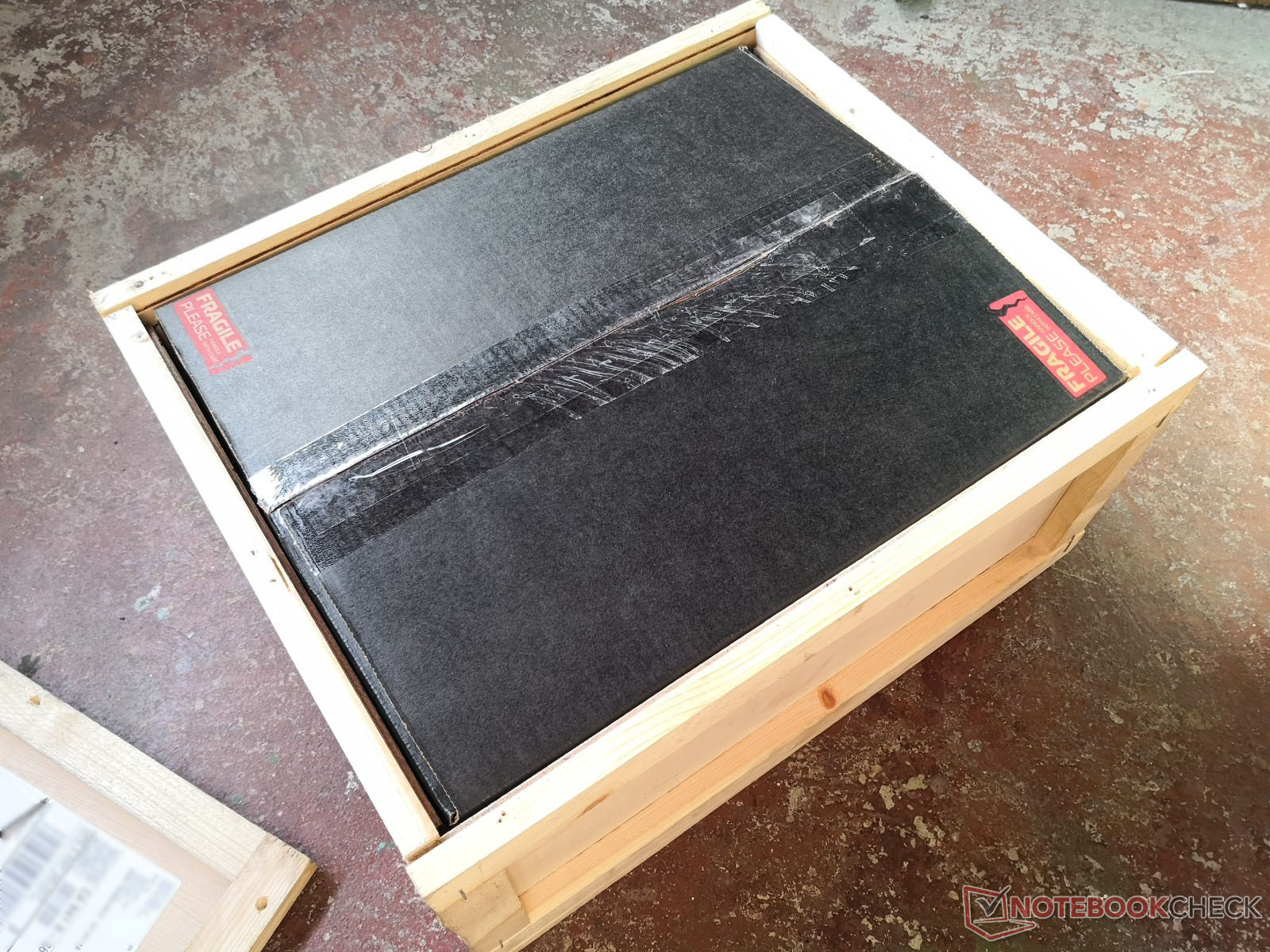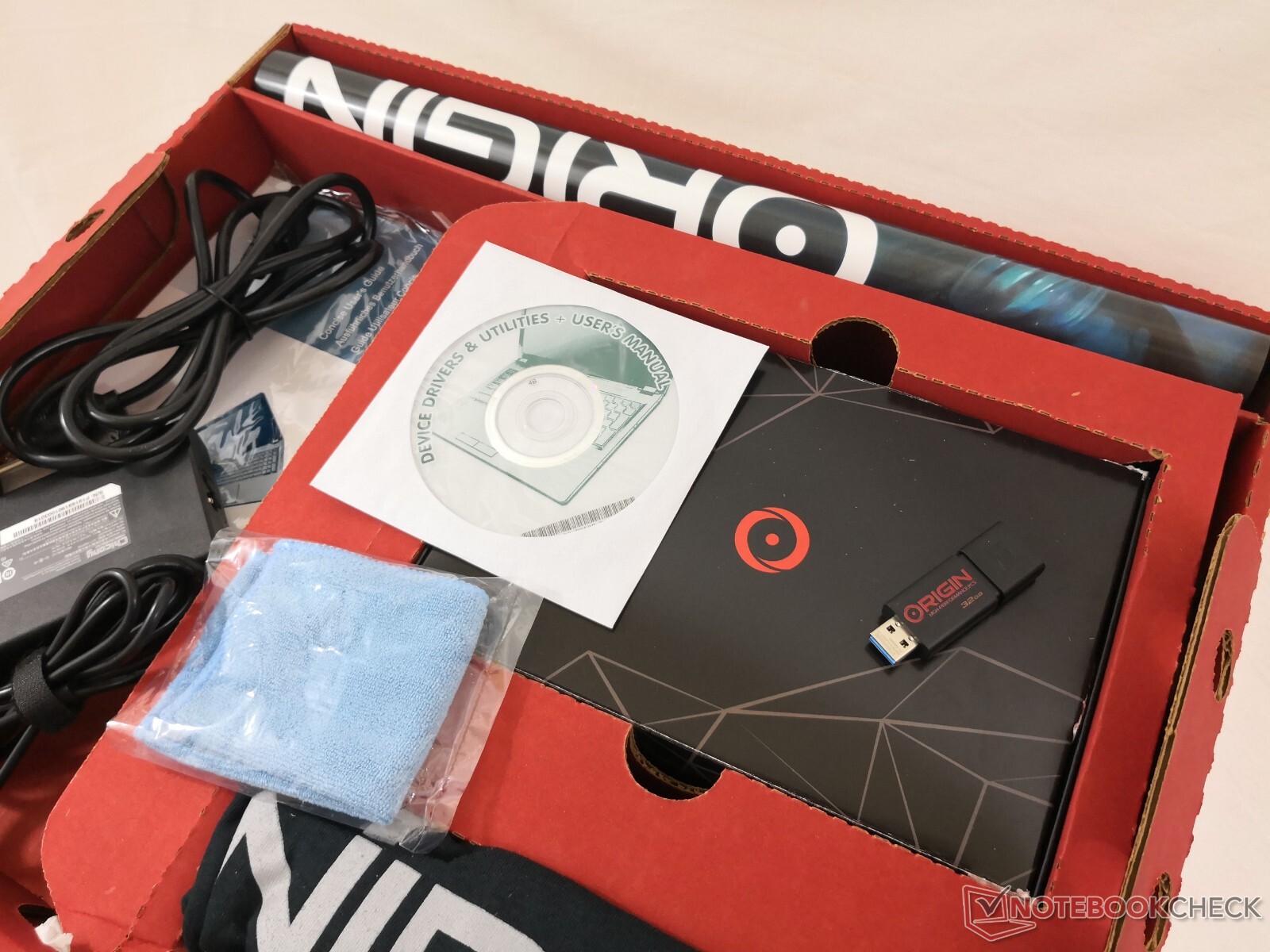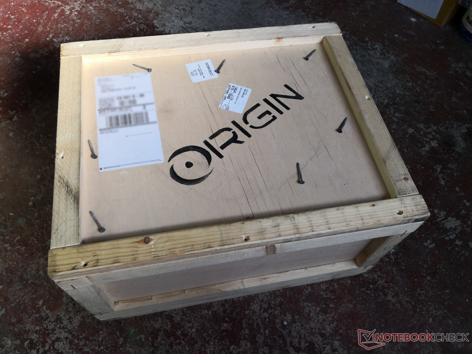 Beim Auspacken geht Origin PC aufs Ganze. Nutzer haben die Möglichkeit, sich statt dem üblichen Pappkarton eine hölzerne Kiste befüllt mit zusätzlichen kostenlosen Extras wie mit einem Poster, einer Notebooktasche, einem T-Shirt, einem Mauspad, einer Treiber-DVD und sogar einem 32-GB-USB-Stick, auf dem sich bereits ab Werk ein Wiederherstellungsabbild befindet, liefern zu lassen.