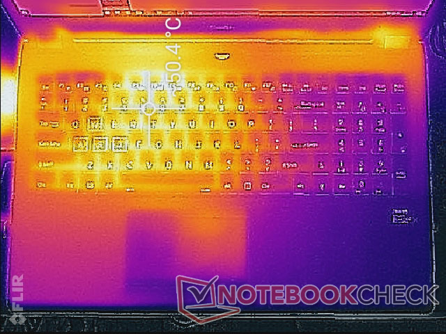 Die linke Hälfte des Chassis ist stets wärmer als die rechte Hälfte. Für einen Gaming-Laptop ist das suboptimal, da die Finger und Handballen von Nutzern dadurch mit den wärmeren Bereichen des Gehäuses in Kontakt kommen. Die Handballenauflagen und WASD-Tasten können im Gaming-Betrieb bis zu 33 °C bzw. 45 °C erreichen. Dahingegen bleiben die rechte Handballenauflage und die Ziffernblocktasten mit 27 °C bis 31 °C relativ kühl. In Titeln, in denen die WASD-Tasten wichtig sind, leidet der Komfort dadurch etwas.