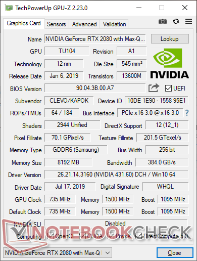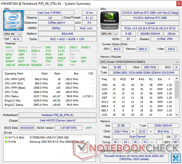 | Origin PC EVO16-S i7-9750H RTX 2080 Max-Q i7-9750H, GeForce RTX 2080 Max-Q, Samsung SSD 970 EVO Plus 500GB, IPS, 1920x1080, 16.1" | Razer Blade 15 RTX 2080 Max-Q i7-9750H, GeForce RTX 2080 Max-Q, Samsung SSD PM981 MZVLB512HAJQ, IPS, 1920x1080, 15.6" | Gigabyte Aero 15 Classic-XA i7-9750H, GeForce RTX 2070 Max-Q, Intel SSD 760p SSDPEKKW512G8, IGZO, 1920x1080, 15.6" | MSI GS75 Stealth 9SG i7-9750H, GeForce RTX 2080 Max-Q, 2x Samsung SSD PM981 MZVLB1T0HALR (RAID 0), IPS, 1920x1080, 17.3" | Asus Zephyrus S GX502GW i7-9750H, GeForce RTX 2070 Mobile, 2x Intel SSD 660p SSDPEKNW512G8 (RAID 0), IPS, 1920x1080, 15.6" | MSI GE75 9SG i9-9880H, GeForce RTX 2080 Mobile, Samsung SSD PM981 MZVLB1T0HALR, AHVA, 1920x1080, 17.3" | |