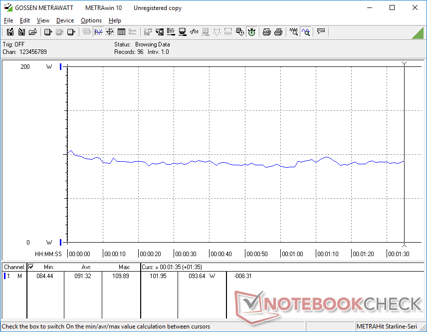 Der maximale Verbrauch, der dem kleinen bis mittelgroßen (~14,3 x 7,5 x 2,9 cm) 180-W-Netzteil abverlangt wurde, lag bei 208,9 W und deutet darauf hin, dass der Hersteller bzw. Vertriebspartner dem Laptop ein leistungsfähigeres Netzteil hätte beilegen sollen. Das Razer Blade 15, das mit der gleichen RTX 2080 Max-Q GPU ausgestattet ist, wird zum Beispiel mit einem leistungsfähigeren 230-W-Netzteil ausgeliefert. In der Praxis geht der Ladevorgang dadurch im Gaming-Betrieb oder in anderen Hochlastsituationen nur kriechend langsam vonstatten.