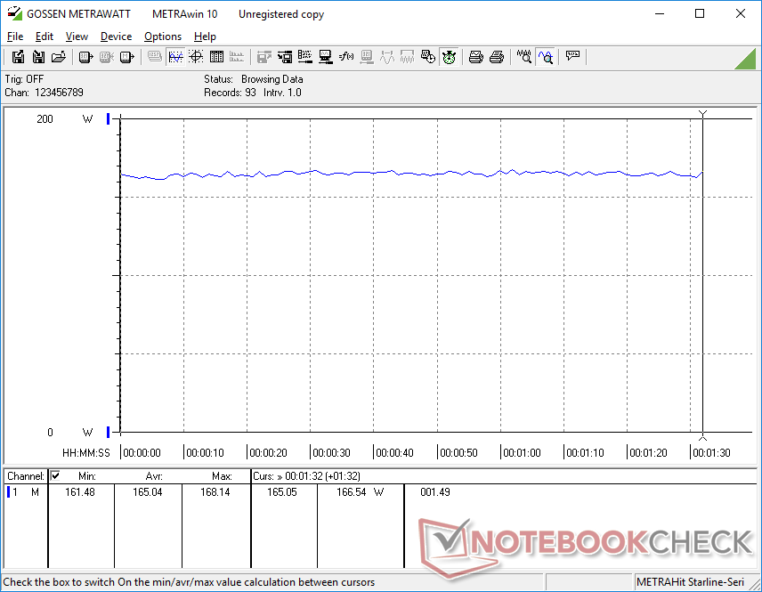 Je nach Helligkeitsstufe und Energieprofil werden im Leerlauf auf dem Desktop zwischen 7 und 21 W verbraucht. Beim Spielen von The Witcher 3 liegt der Verbrauch im Schnitt bei ca. 165 W und damit nahe am Razer Blade 15 und MSI GS75, die beide mit der gleichen RTX 2080 Max-Q GPU ausgestattet sind. Unser Testgerät verbraucht bei einer um ca. 15 Prozent höheren Grafikleistung ungefähr 10 Prozent mehr Strom als ein Laptop mit einer RTX 2070 Max-Q.