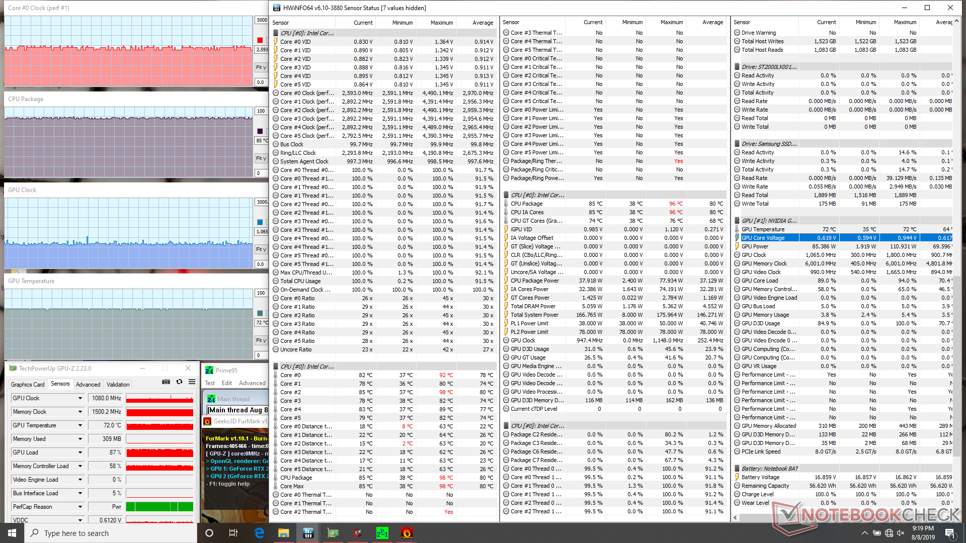Um es auf potenzielles Drosseln und mögliche Stabilitätsprobleme zu testen, lasten wir das System aus. In Prime95 taktet die CPU in den ersten paar Sekunden mit bis zu 4 GHz und erreicht dann eine Kerntemperatur von 98 °C. Kurz darauf fällt die Taktfrequenz auf den 3,1- bis 3,2-GHz-Bereich, um auf Dauer eine kühlere Kerntemperatur von 77 °C zu ermöglichen. Bei der gleichzeitigen Ausführung von Prime95 und FurMark pendeln sich die CPU- und GPU-Temperaturen bei 85 °C bzw. 72 °C ein.